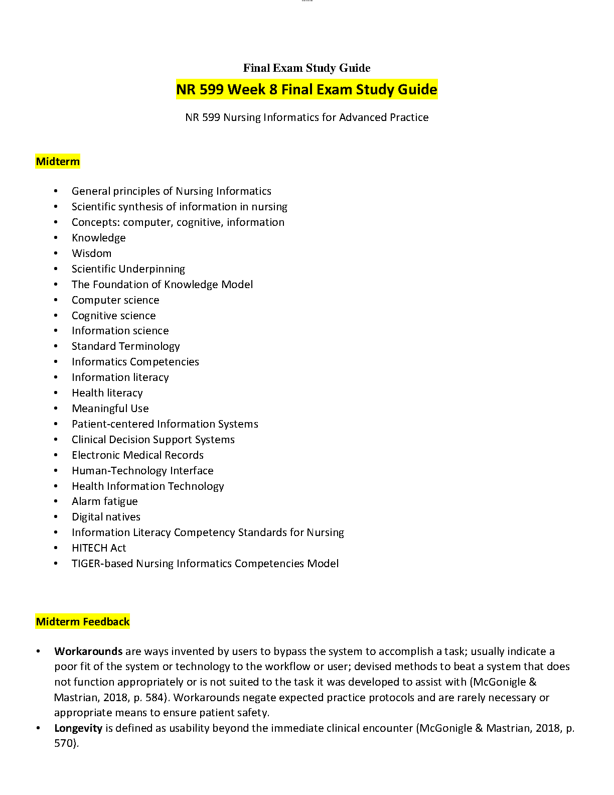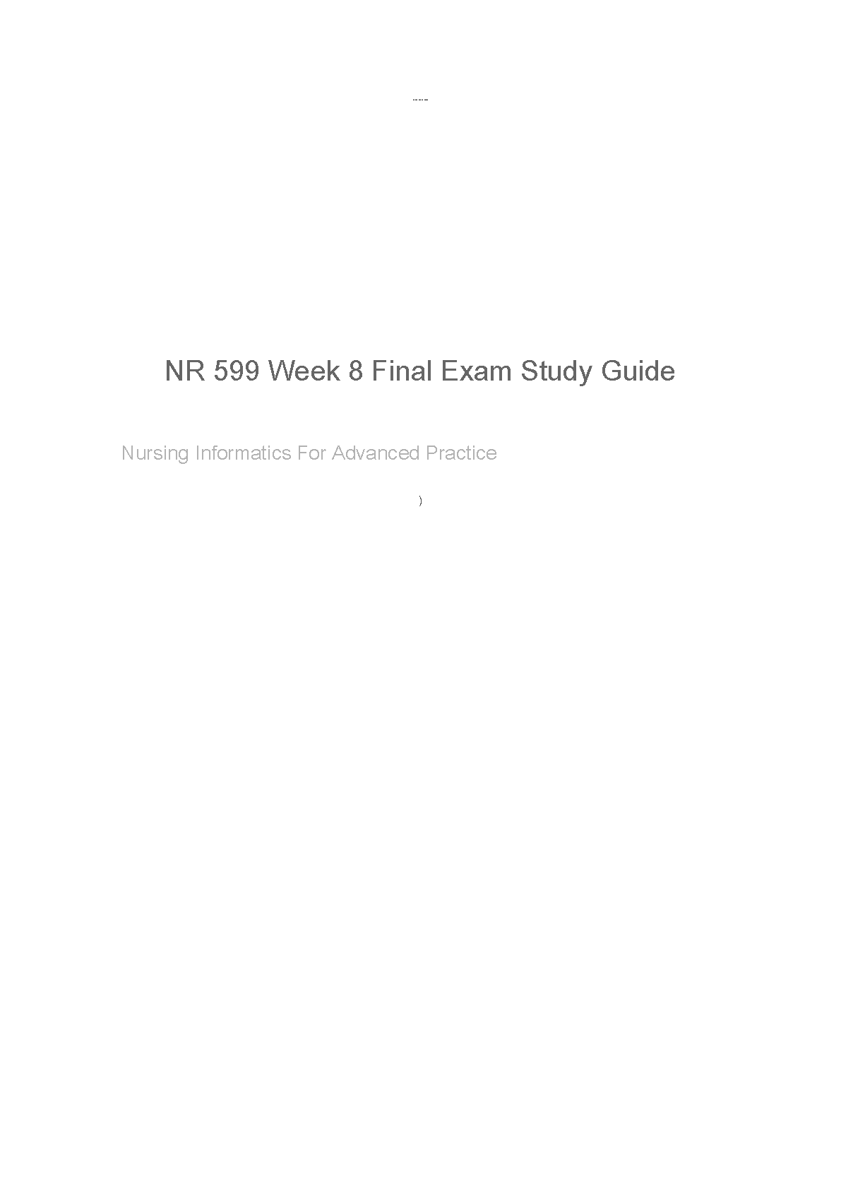 Unlock your full potential with our comprehensive study guide for the NR 599 Week 8 Final Exam on Nursing Informatics for Advanced Practice. This resource, fully updated for the 2025/2026 academic year, is meticulously crafted to cover all key concepts, theories, and practical applications you'll face. It's the ultimate tool to help you grasp complex topics, prepare effectively, and pass your final exam with confidence on your very first attempt, eliminating the need for costly resits.