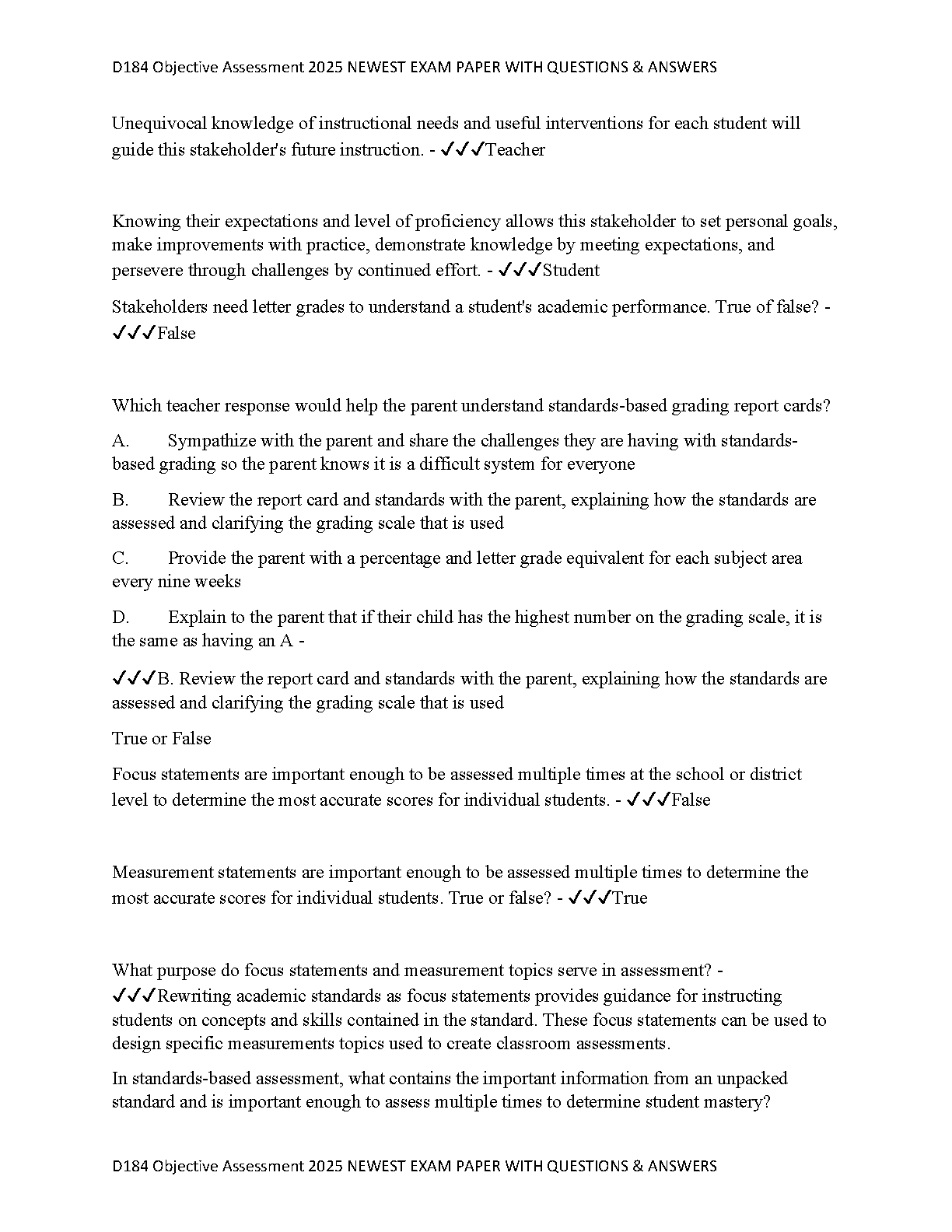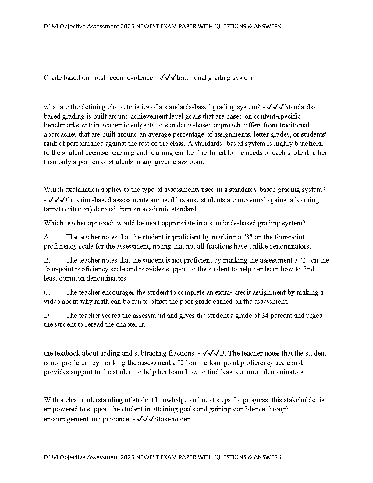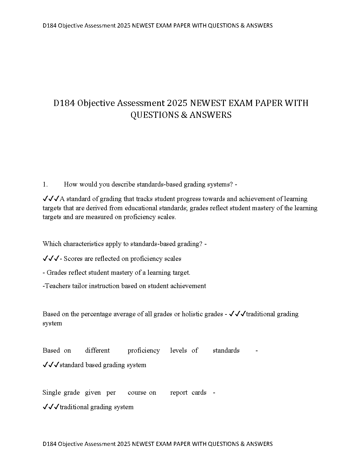 Prepare to excel in your WGU D184 Innovative and Strategic Thinking course with this comprehensive and up-to-date test bank for the 2025/2026 academic year. This resource provides a complete set of questions and expertly verified answers for the D184 Objective Assessment. Master complex topics like standards-based grading systems and more, ensuring you have the knowledge to pass your exam on the very first attempt. Our study guide is designed to boost your confidence and help you avoid costly and time-consuming resits. Get instant access to the materials you need for a guaranteed pass!