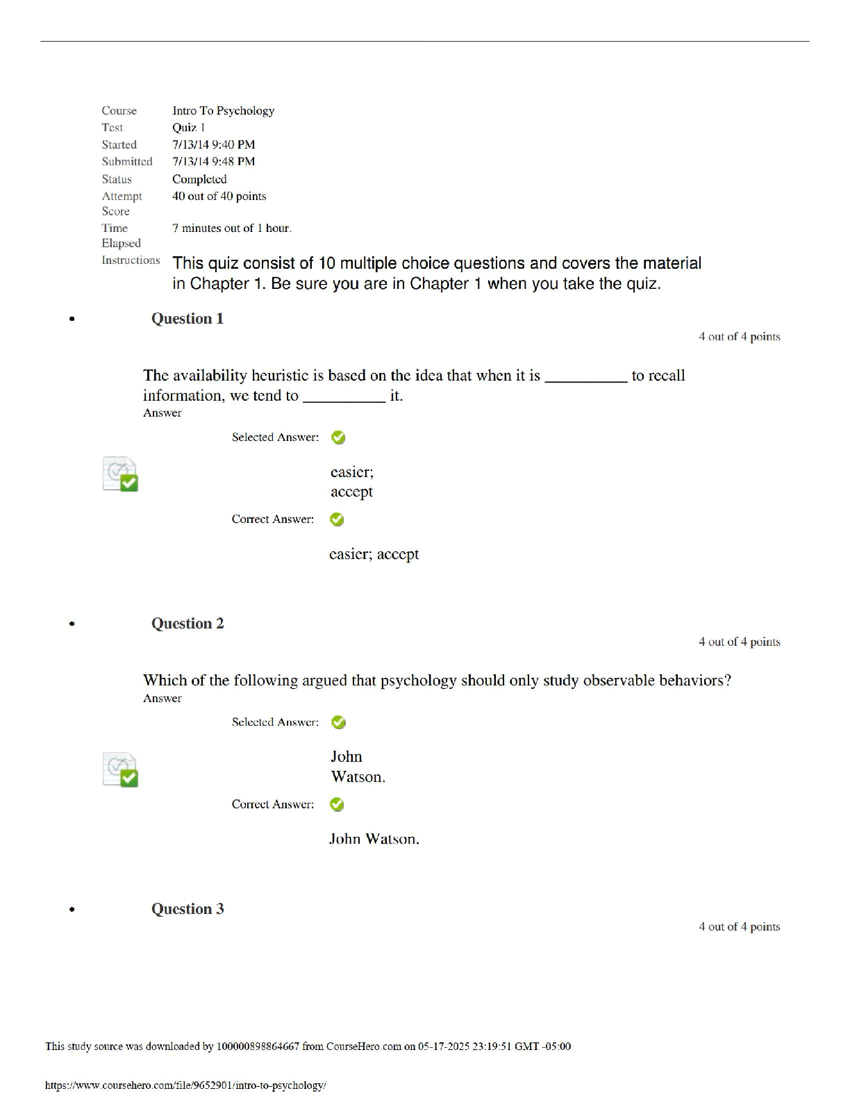 Master the fundamentals of your Intro to Psychology course with this complete test bank for Quiz 1, covering essential topics from Chapter 1. This study guide features all multiple-choice questions with 100% correct, verified answers, proven by a perfect 40/40 score. Dive into key concepts like the availability heuristic and the history of behaviorism with figures like John Watson. This resource is expertly designed to help you prepare effectively, ace your exams, and avoid resits. Download today for a reliable path to success in your psychology studies.