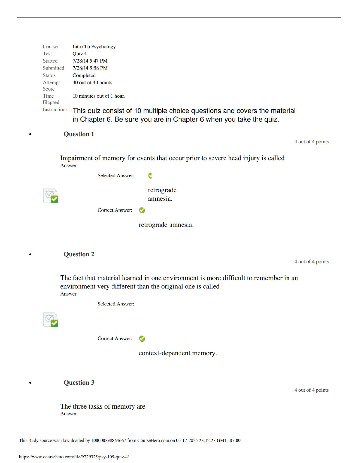 Master the fundamental concepts of memory with this comprehensive test bank for Chapter 6 of 'Psychology in Your Life,' 4th Edition. This essential resource provides the complete Quiz 4 for PSY 105 Introduction to Psychology, featuring all questions with 100% verified correct answers. Deepen your understanding of key topics such as retrograde amnesia, context-dependent memory, and the core tasks of memory. This study guide is the perfect tool for students aiming to excel in their exams, ensure a thorough grasp of the material, and achieve top grades in their psychology course.