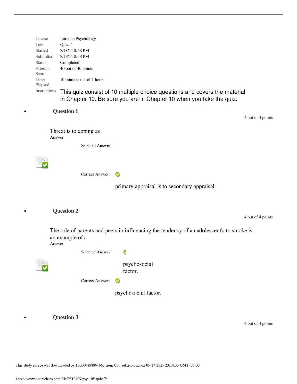 Unlock a perfect score in your Intro to Psychology course with this verified PSY 105 Quiz 7 Test Bank. This essential study aid provides all the correct answers for the Chapter 10 quiz, covering critical topics like stress, coping mechanisms, primary and secondary appraisal, and psychosocial influences. With a demonstrated 100% accuracy (40/40 points), this test bank is your key to understanding complex concepts and excelling in your exams. Stop guessing and start acing your psychology tests. Download now to boost your grade and master the material efficiently.