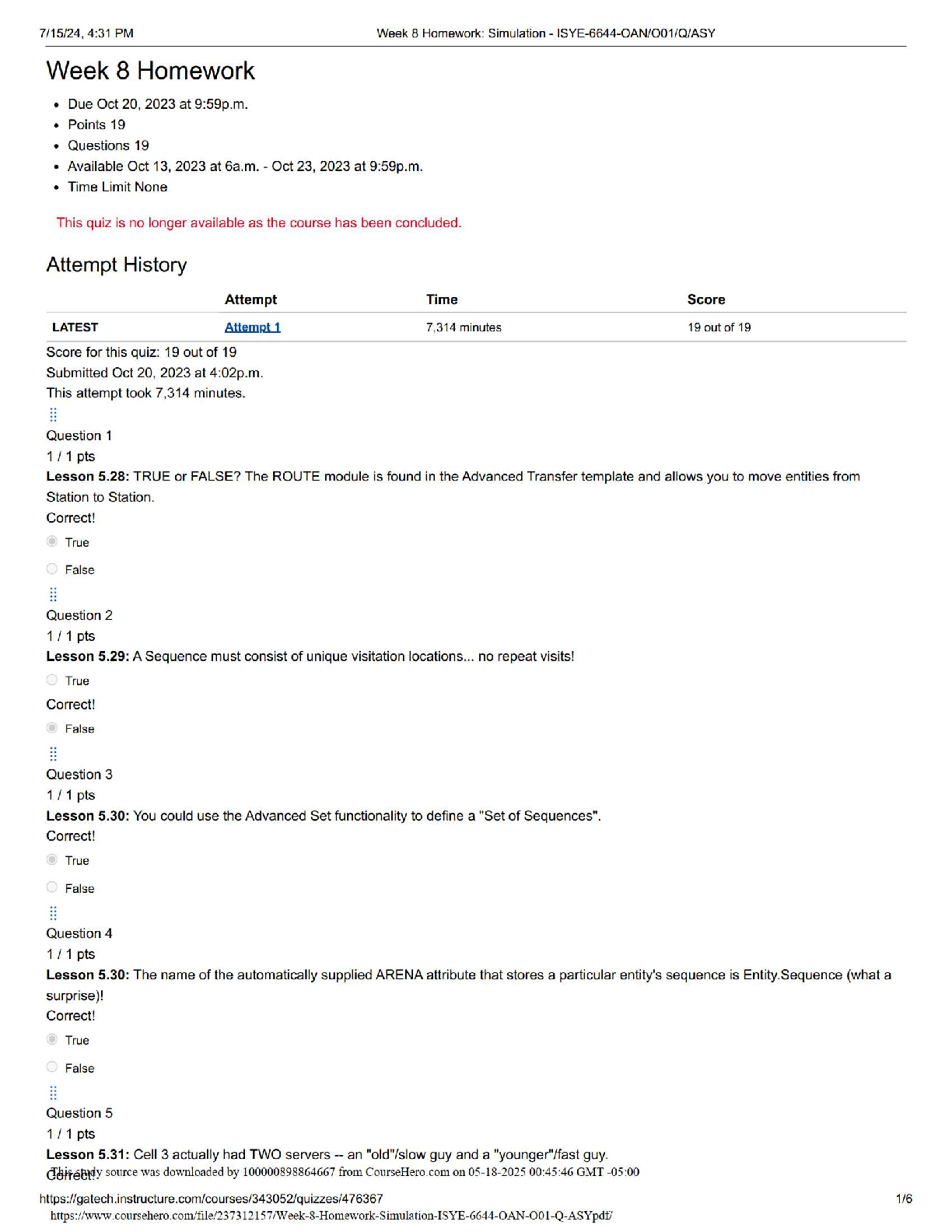 Ace your ISYE 6644 Simulation course with this verified solution guide for the Week 8 Homework quiz. This comprehensive resource provides the complete set of 19 questions along with their correct answers, verified with a 100% score (19/19). It covers key topics from 'Simulation with Arena, 6th Edition' by W. David Kelton, Randall P. Sadowski, and Nancy B. Zupick, including the ROUTE module, Advanced Transfer templates, Sequences, and Set functionality. This study guide is the perfect tool to help you understand the material, prepare effectively for your exams, and secure a top grade.