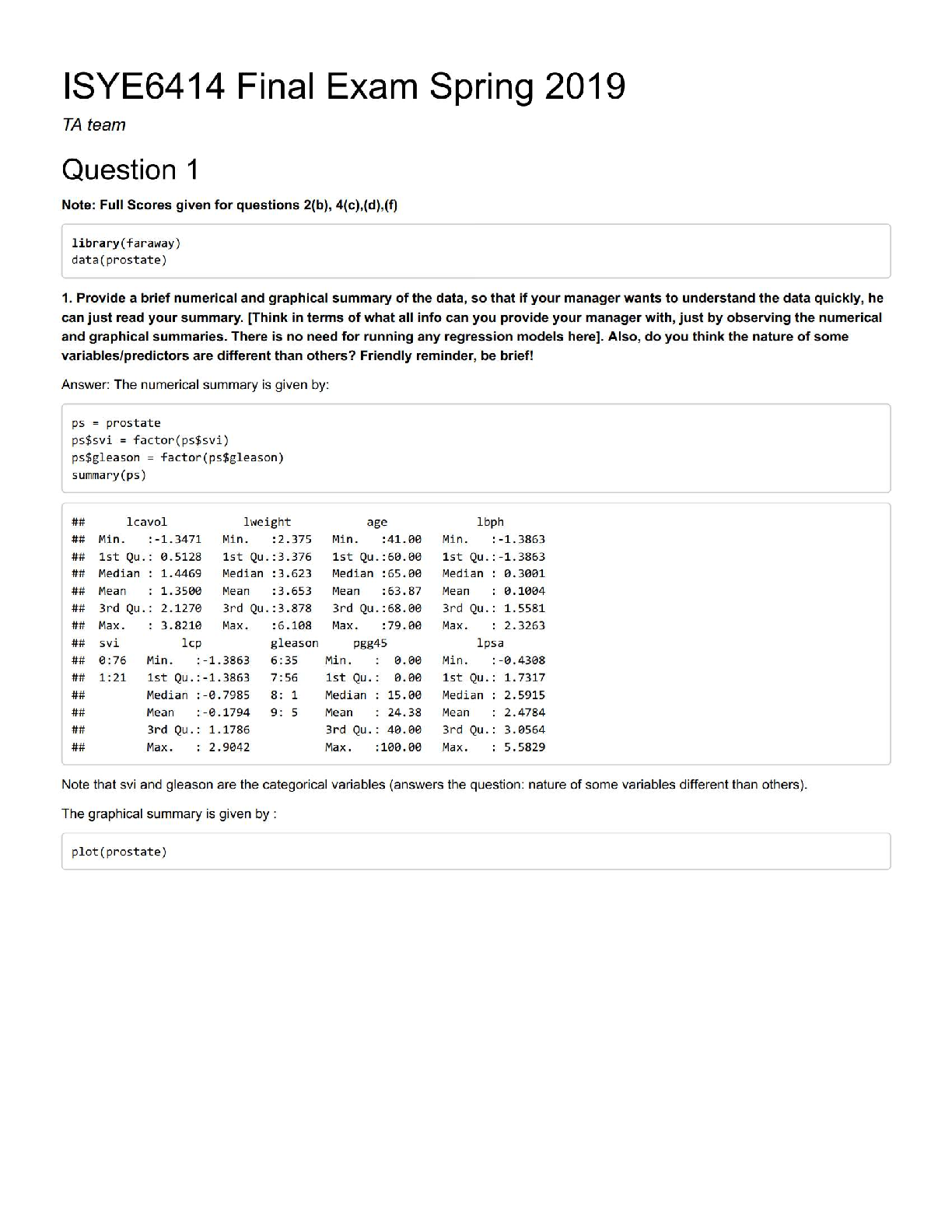 Unlock success in your Georgia Tech Regression Analysis course with this comprehensive resource for the ISYE 6414 Final Exam from Spring 2019. This study guide features fully elaborated questions and answers, including the exact R code and output for analyzing the 'prostate' dataset. Ideal for exam preparation, this material provides a clear example of expected solutions, helping you master key statistical concepts and ace your exams with confidence.