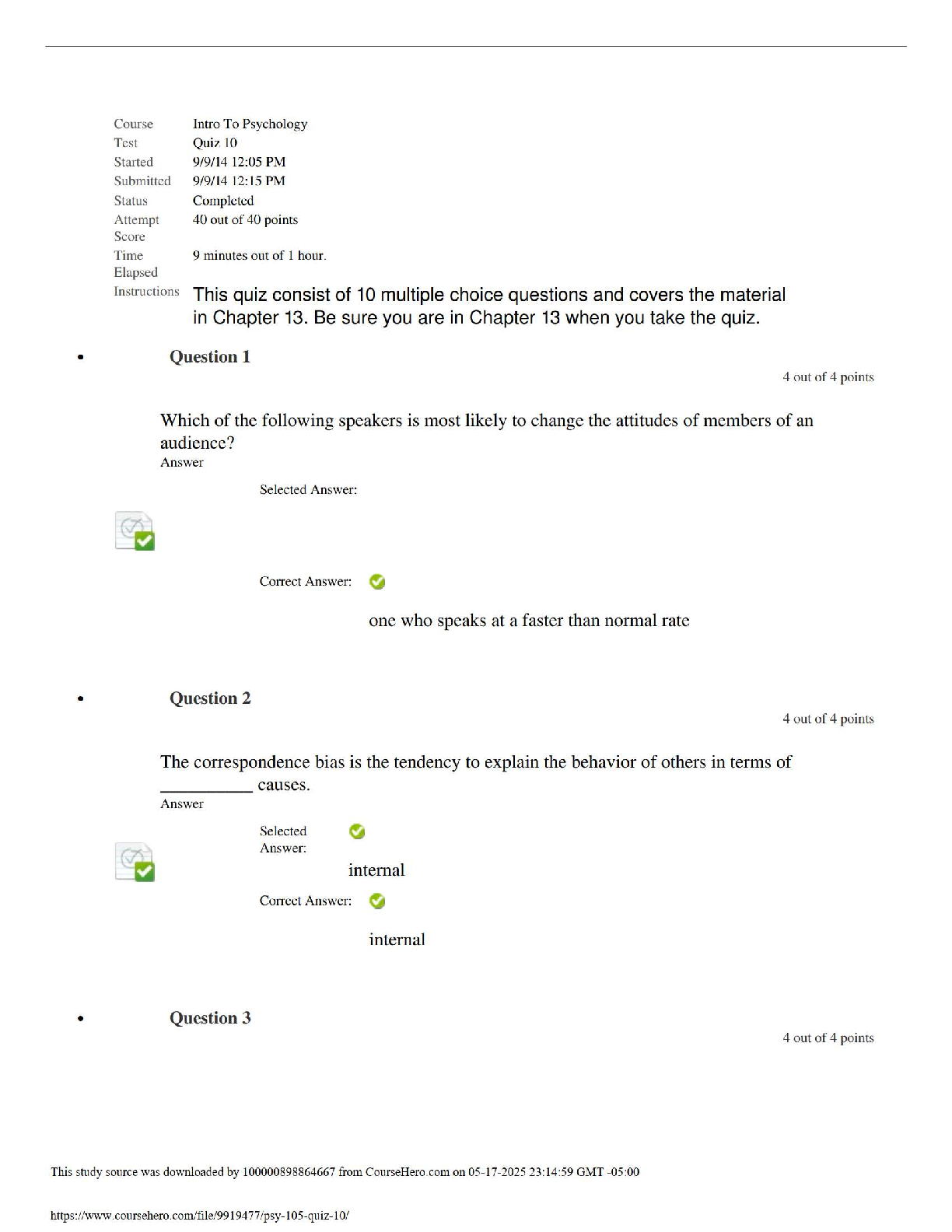 Unlock academic success in your PSY 105 Introduction to Psychology course with this comprehensive test bank for Chapter 13: Social Psychology. This resource features Quiz 10, complete with multiple-choice questions and 100% verified correct answers, mirroring a perfect 40/40 score. Master key concepts such as persuasion techniques, attribution theories like the correspondence bias, and other core principles of social psychology. This study guide is expertly designed to help you ace your exams, understand complex topics, and achieve top grades. Download now to get a step ahead in your studies.
