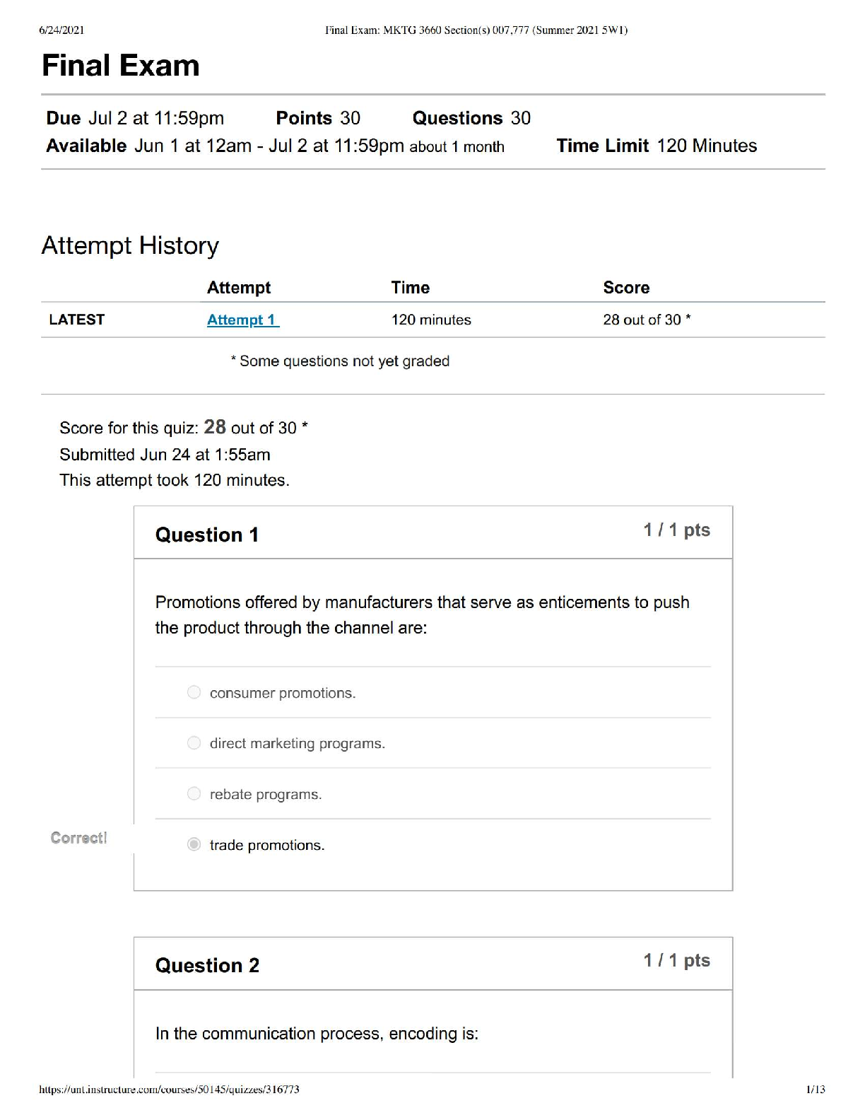 Ace your MKTG 3660 Final Exam with this comprehensive and recently updated 2025/2026 study guide. This exam elaboration features a complete set of 30 questions from a recent final, complete with verified correct answers. Covering key topics like trade promotions, the communication process, and core marketing principles, this resource is expertly designed to mirror the actual exam format. By studying with these real questions, you'll gain the confidence and knowledge needed to pass on your first attempt and avoid costly resits. Download now for an instant A-grade resource.