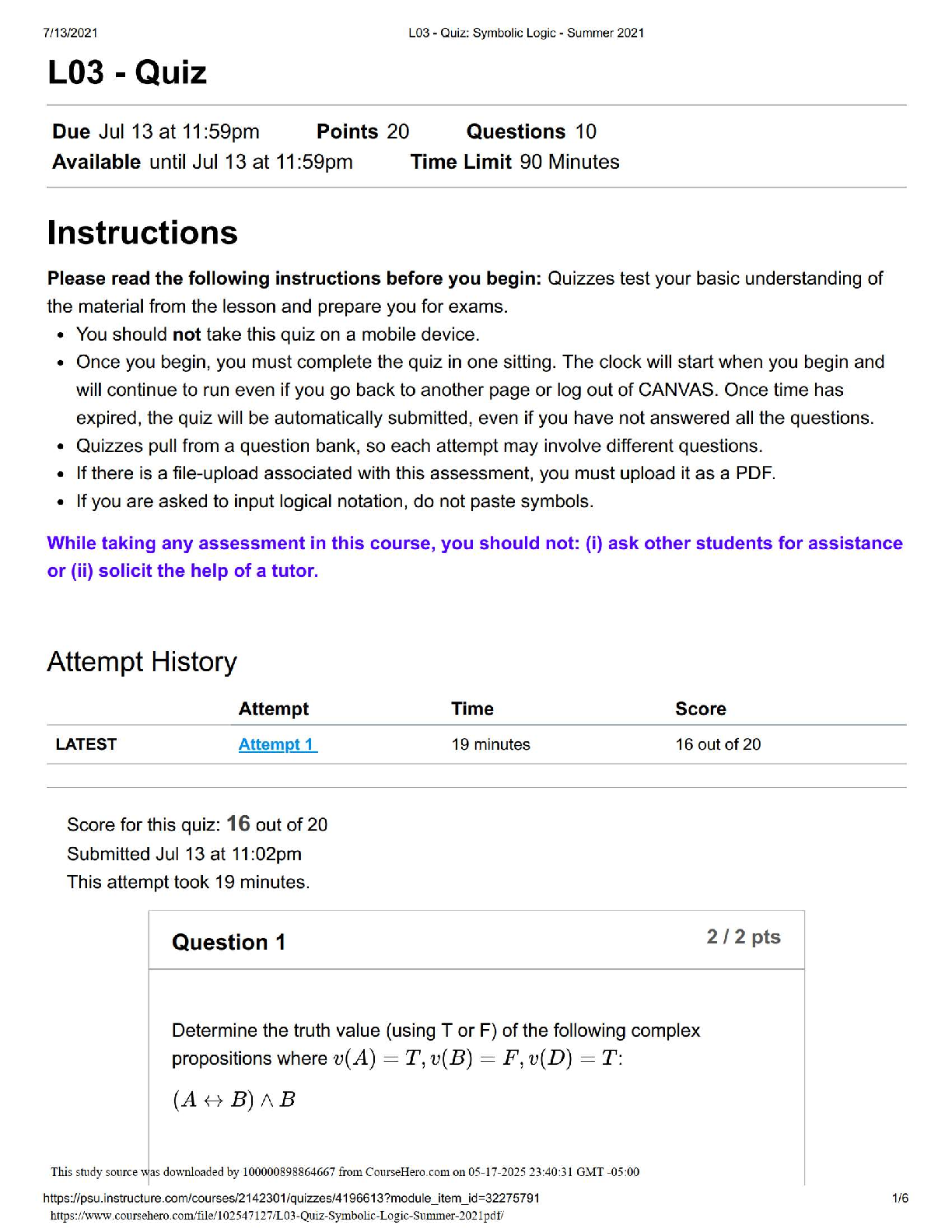 Struggling with Symbolic Logic? Ace your L03 Quiz with this comprehensive test bank from a Summer 2021 PSU course. This resource contains the complete 10-question quiz, focusing on key concepts like determining truth values (T/F) for complex logical propositions. See a real student's attempt, scoring 16 out of 20, providing you with verified answers and a clear understanding of what to expect. This is the perfect study tool to master logical notation, practice for your exams, and secure a top grade. Avoid resits and pass on your first try by studying with proven materials.