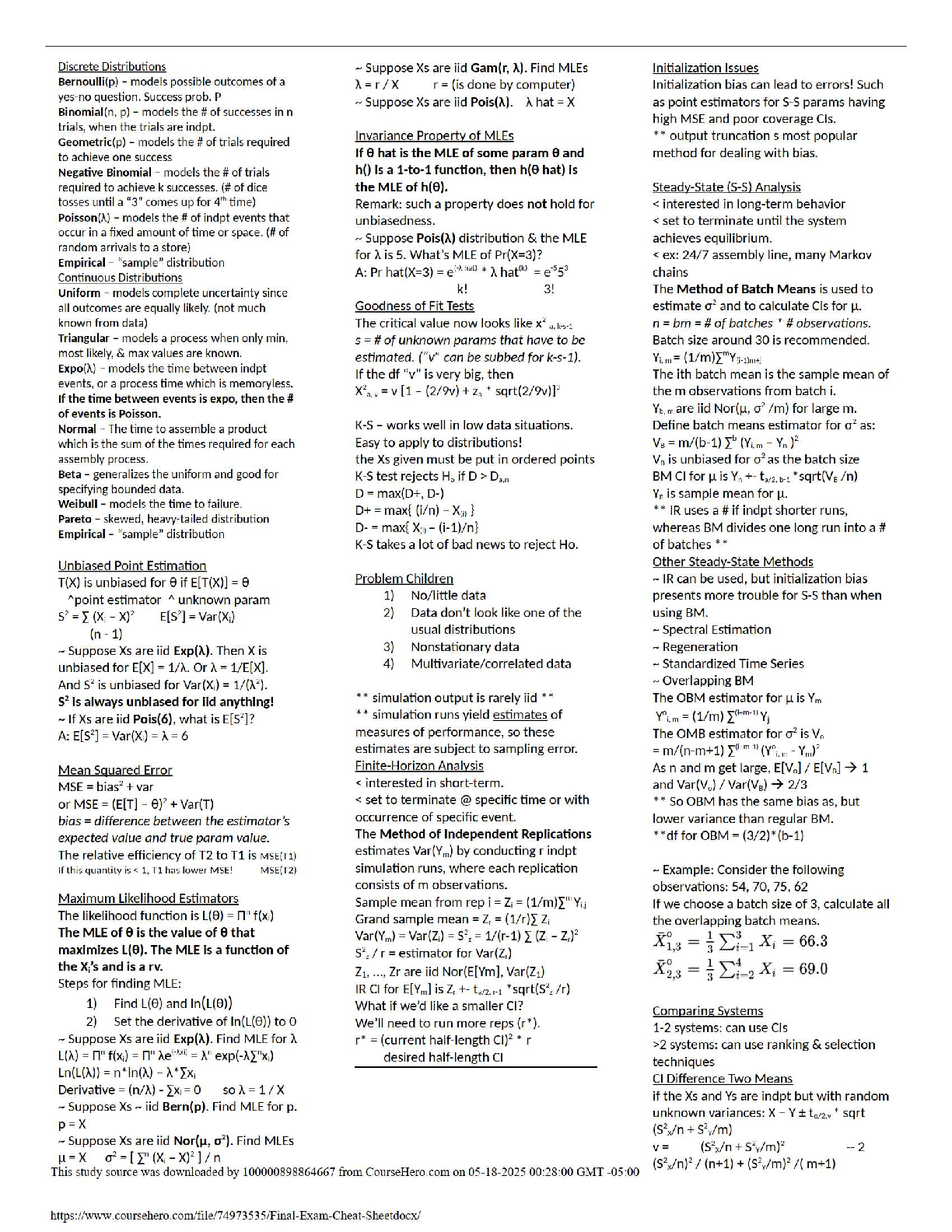 Get the ultimate edge for your final exams with this comprehensive and condensed cheat sheet for 'Simulation Modeling and Analysis, 5th Edition' by Averill M. Law. This meticulously crafted study guide for the 2025/2026 academic year covers all critical topics you need to master for a first-attempt pass. Dive deep into essential concepts including Discrete and Continuous Probability Distributions, Maximum Likelihood Estimators (MLE), Unbiased Point Estimation, Mean Squared Error, Goodness-of-Fit tests, and advanced Steady-State analysis techniques like the Method of Batch Means and Independent Replications. Avoid resits and secure top grades with this essential, easy-to-follow resource that simplifies complex simulation theories and formulas.