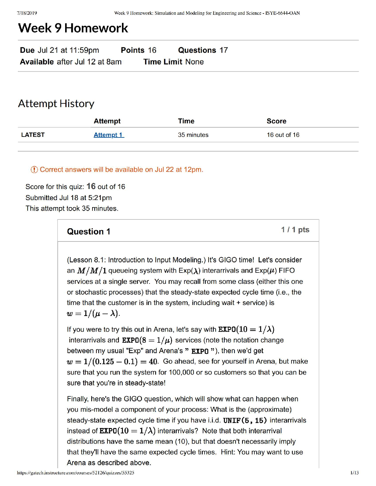 Master the complexities of ISYE 6644 Simulation and Modeling for Engineering and Science with this comprehensive test bank featuring the complete Week 9 Homework assignment. This resource provides fully solved questions, achieving a perfect score of 16/16. Dive deep into key topics such as M/M/1 queueing systems, Introduction to Input Modeling, and practical applications in Arena software. Each solution is detailed, offering clear explanations to help you grasp difficult concepts and excel in your exams. This is an essential study aid for students aiming to solidify their understanding and achieve top grades in their simulation and modeling coursework.