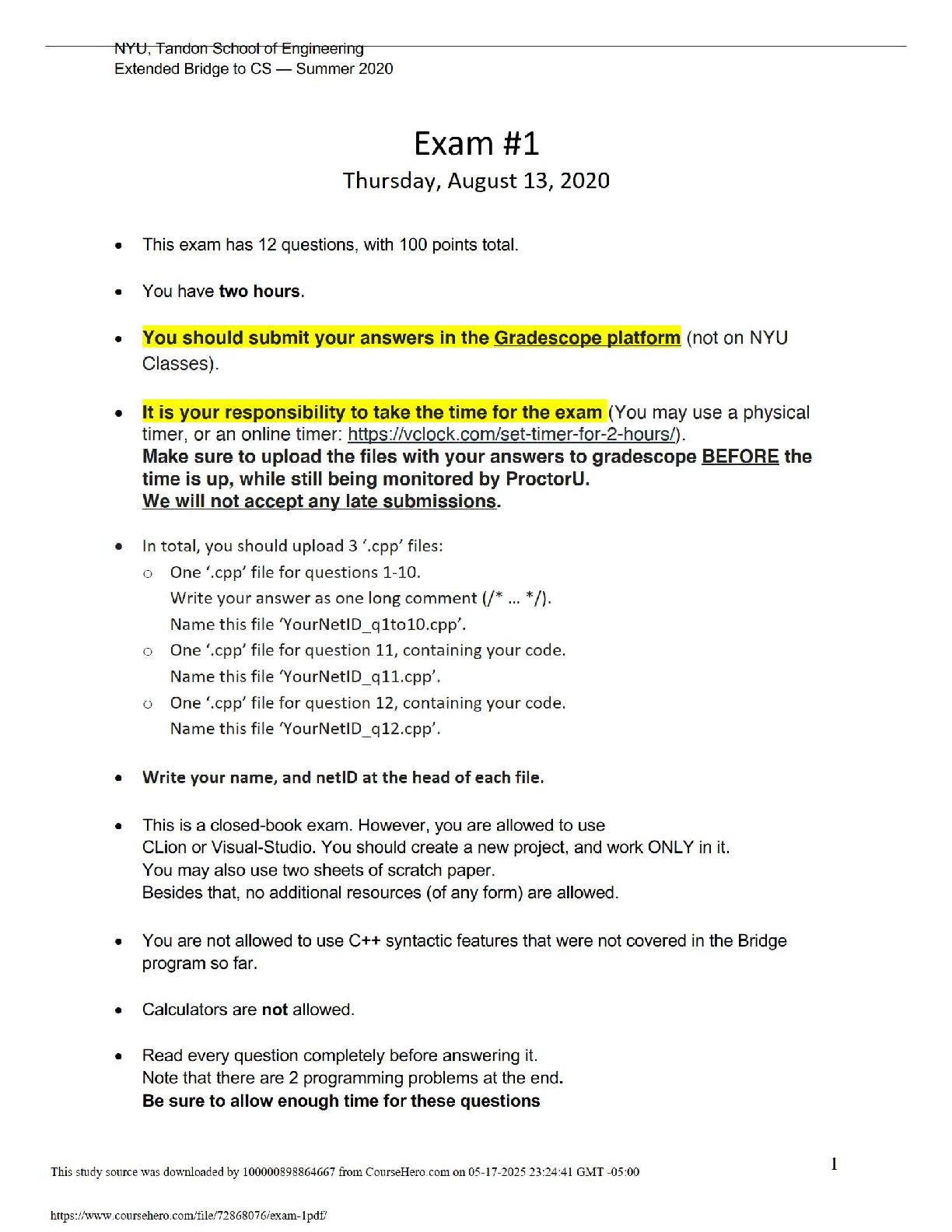 Unlock success in your NYU Tandon School of Engineering 'Extended Bridge to CS' course with this essential study resource. This package features the complete Exam #1 paper, providing a clear insight into the exam structure, question types, and C++ programming challenges you'll face. Updated for the 2025/2026 academic year, this guide is expertly designed to help you prepare effectively, master key concepts, and pass your exams on the very first attempt. Avoid the stress of resits by studying with proven materials that cover everything from basic syntax to complex programming problems. Get the edge you need to excel in your computer science journey!