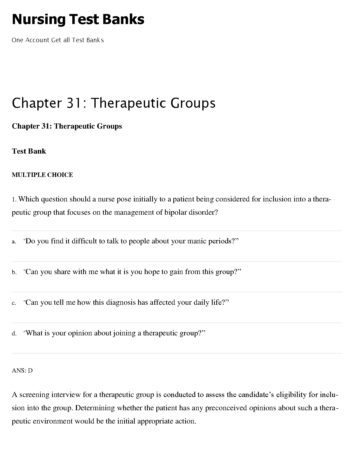 TEST BANK FOR NURSING (Chapter 31: Therapeutic Groups)