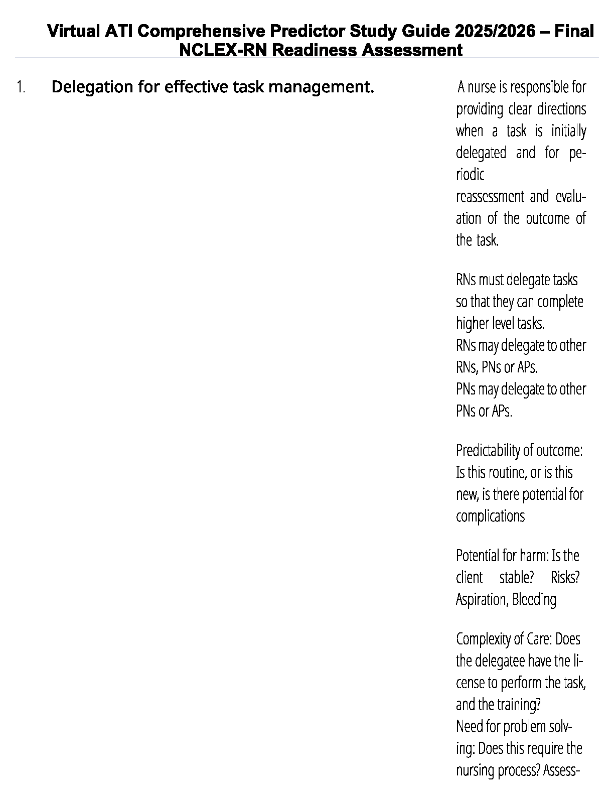Ace your nursing boards with the newest 2025/2026 Virtual ATI Comprehensive Predictor Study Guide. This essential resource is specifically designed as a final readiness assessment to ensure you pass the NCLEX-RN exam on your very first attempt. This guide provides in-depth coverage of crucial nursing concepts, including a detailed breakdown of effective delegation and task management for RNs. Get the ultimate preparation tool to master complex topics, avoid costly resits, and launch your nursing career with confidence.