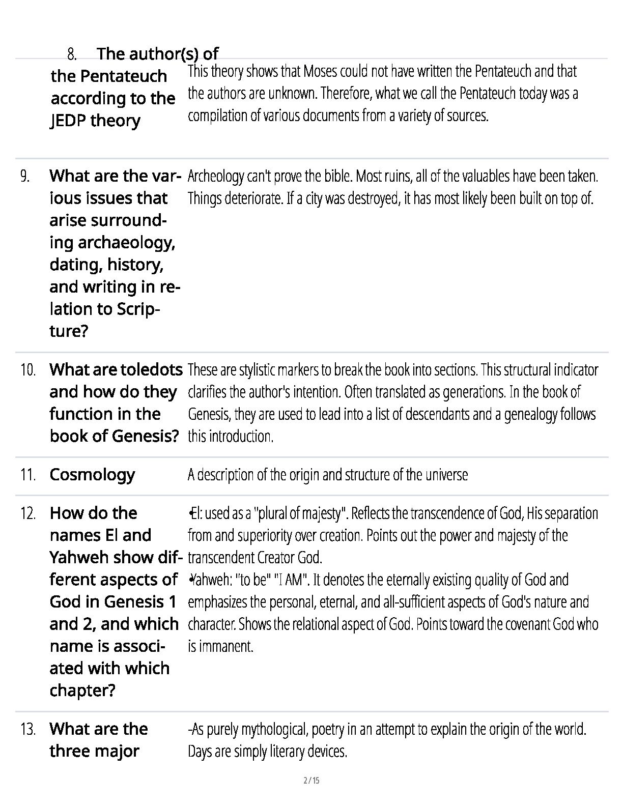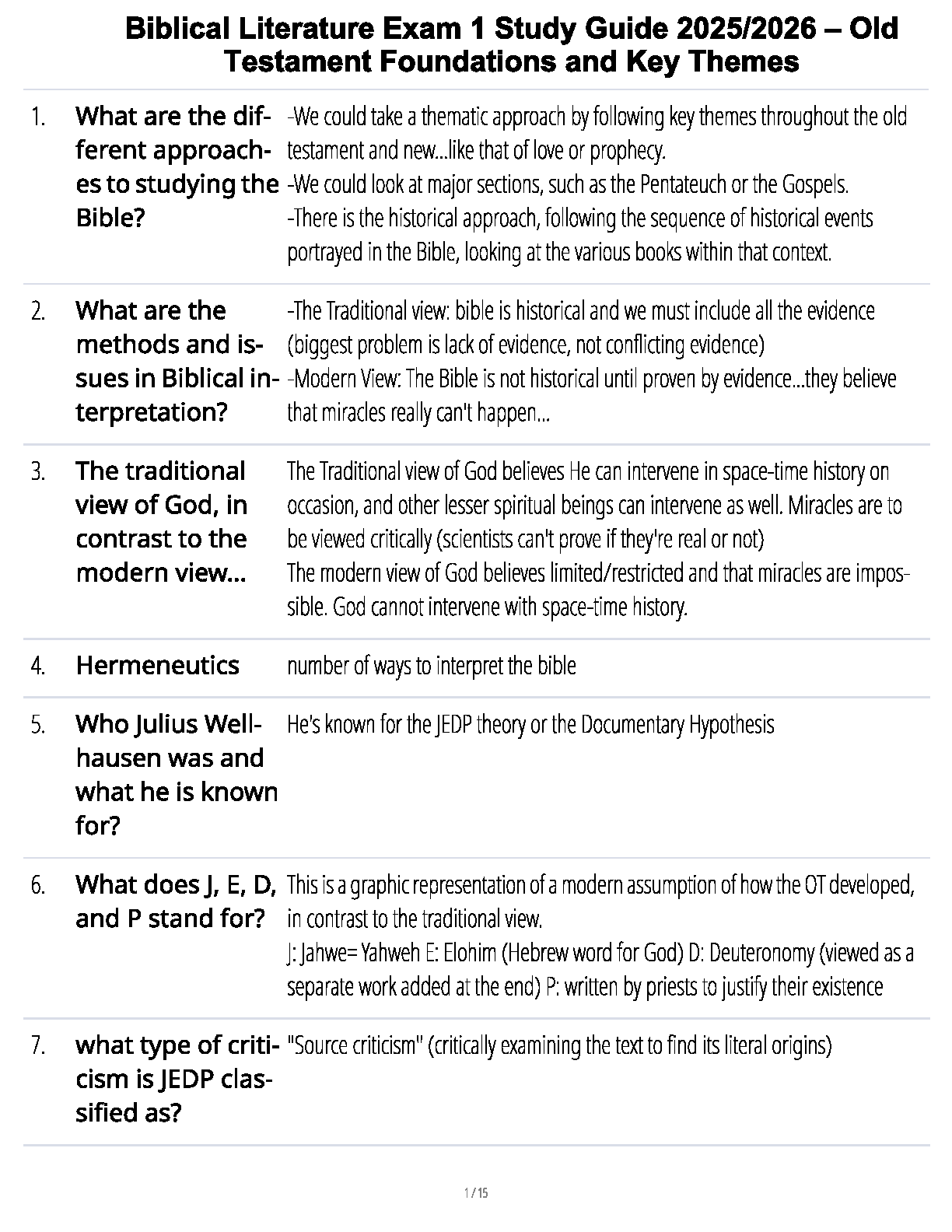 Secure your success in Biblical Literature with our comprehensive study guide for Exam 1, fully updated for the 2025/2026 academic year. This guide provides detailed, easy-to-understand answers covering Old Testament Foundations and Key Themes. You'll master different approaches to studying the Bible, unpack the complexities of Biblical interpretation, and explore crucial concepts like Hermeneutics and the JEDP theory (Documentary Hypothesis). Designed to help you avoid resits, this resource is your key to acing the exam on the first try.