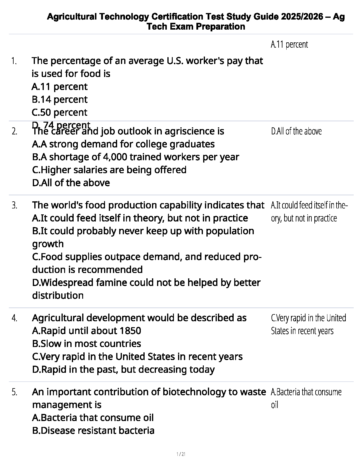 Ace your Agricultural Technology Certification with our comprehensive 2025/2026 Ag Tech Exam Test Bank. This essential study guide is packed with hundreds of practice questions and detailed, verified answers covering all key areas of agricultural technology and agriscience. Designed to mirror the actual exam format, this resource is your key to mastering the material, boosting your confidence, and passing on your very first try. Download now to start your journey towards certification success!