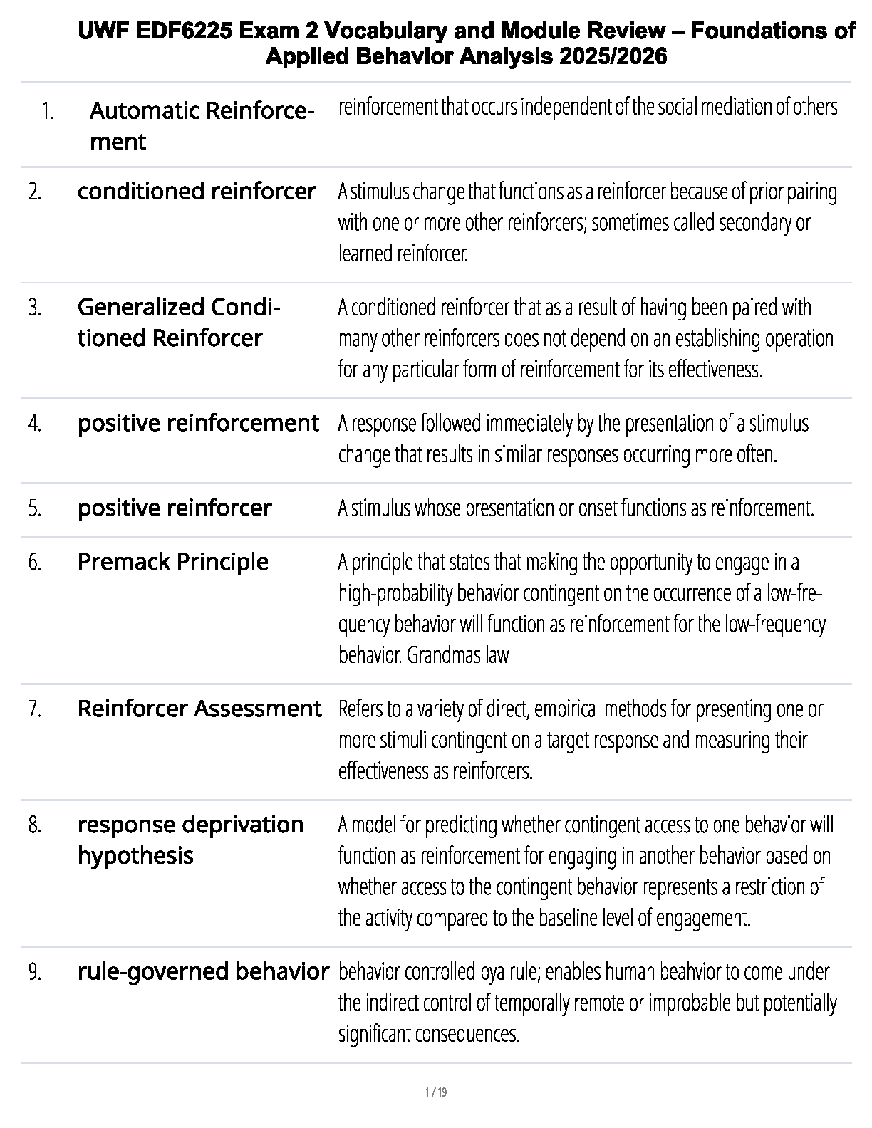 Struggling with the complex terminology for EDF6225? Guarantee your success on Exam 2 with this comprehensive review guide. This essential resource, fully updated for the 2025/2026 academic year, breaks down all the critical vocabulary and module concepts from Foundations of Applied Behavior Analysis. It provides clear, concise definitions for key terms you need to know, from 'Automatic Reinforcement' to the 'Premack Principle.' Aligned with the industry-standard textbook by John O. Cooper, Timothy E. Heron, and William L. Heward (3rd Edition), this study guide is meticulously designed to help you understand the material deeply, avoid resits, and pass your exam on the very first attempt. Download now and master the foundational principles of ABA!