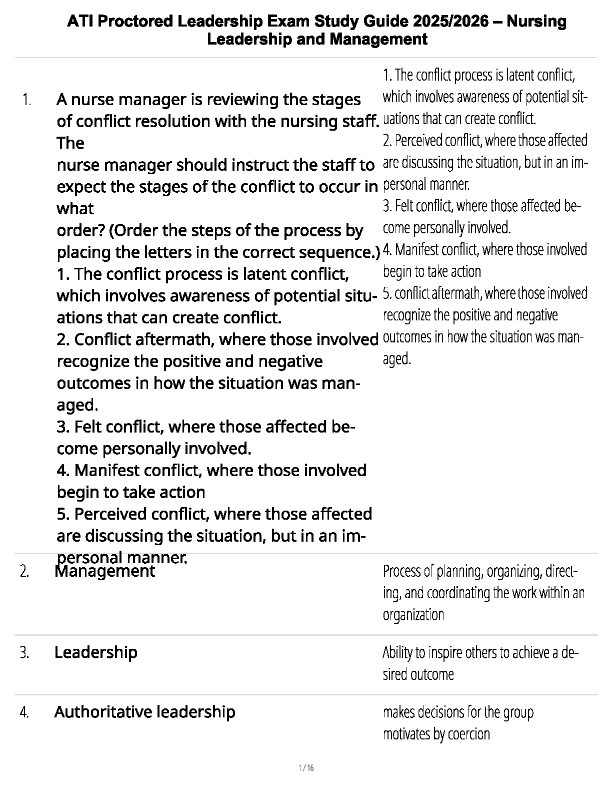 Are you ready to excel in your ATI Proctored Leadership Exam? Our newly updated study guide for the 2025/2026 academic year is your key to success. This comprehensive resource covers all critical topics in Nursing Leadership and Management, including detailed explanations of conflict resolution stages, leadership theories, and management principles. Designed to help you master the material efficiently and pass your exam on the first attempt, this guide is the perfect tool to avoid resits and advance in your nursing career.