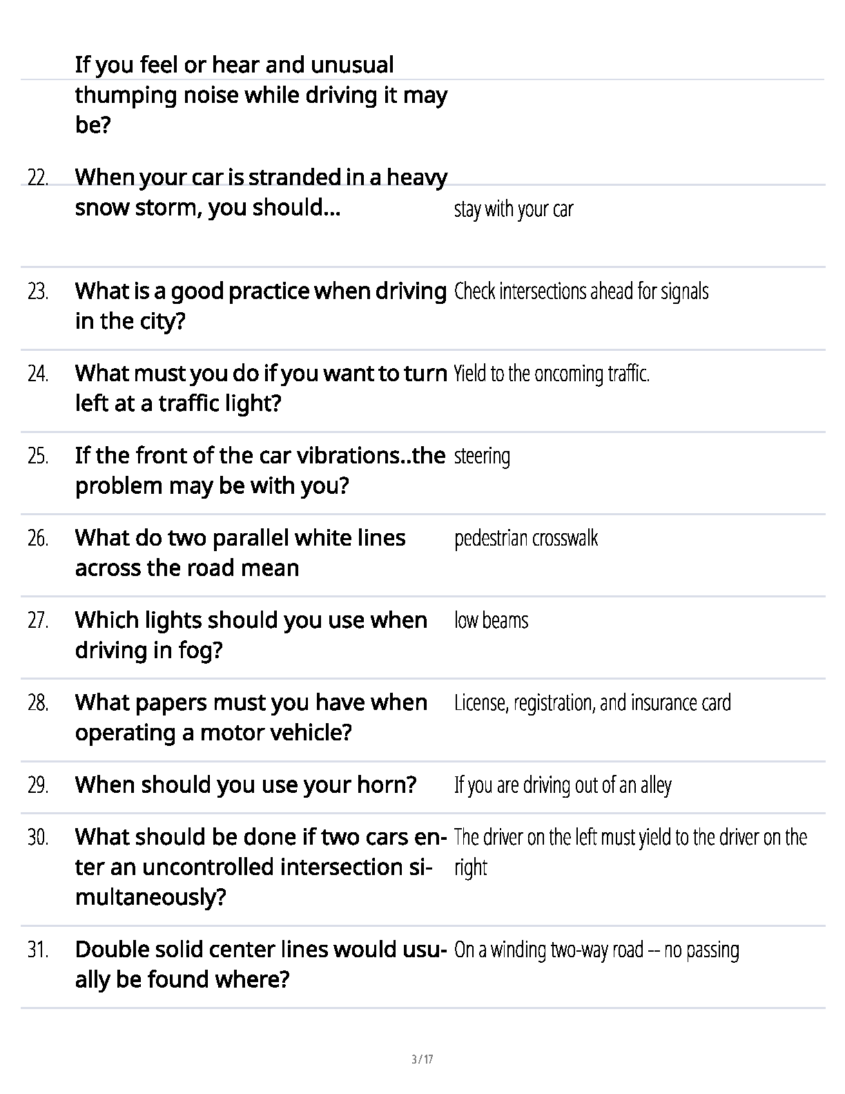 Get ready to pass your Iowa Learner's Permit Test on the very first try with our expertly crafted 2025/2026 study guide! This comprehensive collection of flashcards, based on the official Iowa Department of Transportation (DOT) handbook, covers all the critical questions and answers you need to know. Master essential topics like traffic laws, road signs, parking rules, and safe driving practices. Our easy-to-use Q&A format is designed for rapid learning, making it the perfect tool to ace your exam and get on the road. Avoid the stress of resits and start studying smart with the most up-to-date prep material available!