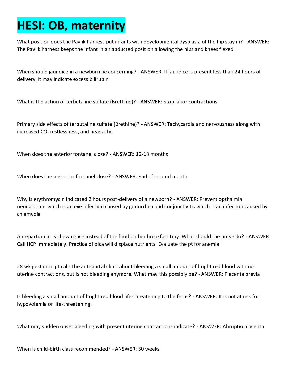 Ace your HESI OB & Maternity exams with confidence using our latest 2025/2026 study guide. This comprehensive resource is packed with essential questions and detailed answers, meticulously curated to cover the most critical topics in obstetrics and maternity nursing. From understanding newborn conditions like jaundice and developmental dysplasia to mastering pharmacological interventions and recognizing antepartum emergencies such as placenta previa and abruptio placenta, this guide has you covered. Designed for nursing students aiming for a first-time pass, our Q&A format simplifies complex concepts and streamlines your study process. Stop worrying about resits and start preparing effectively to achieve top scores on your HESI exams!