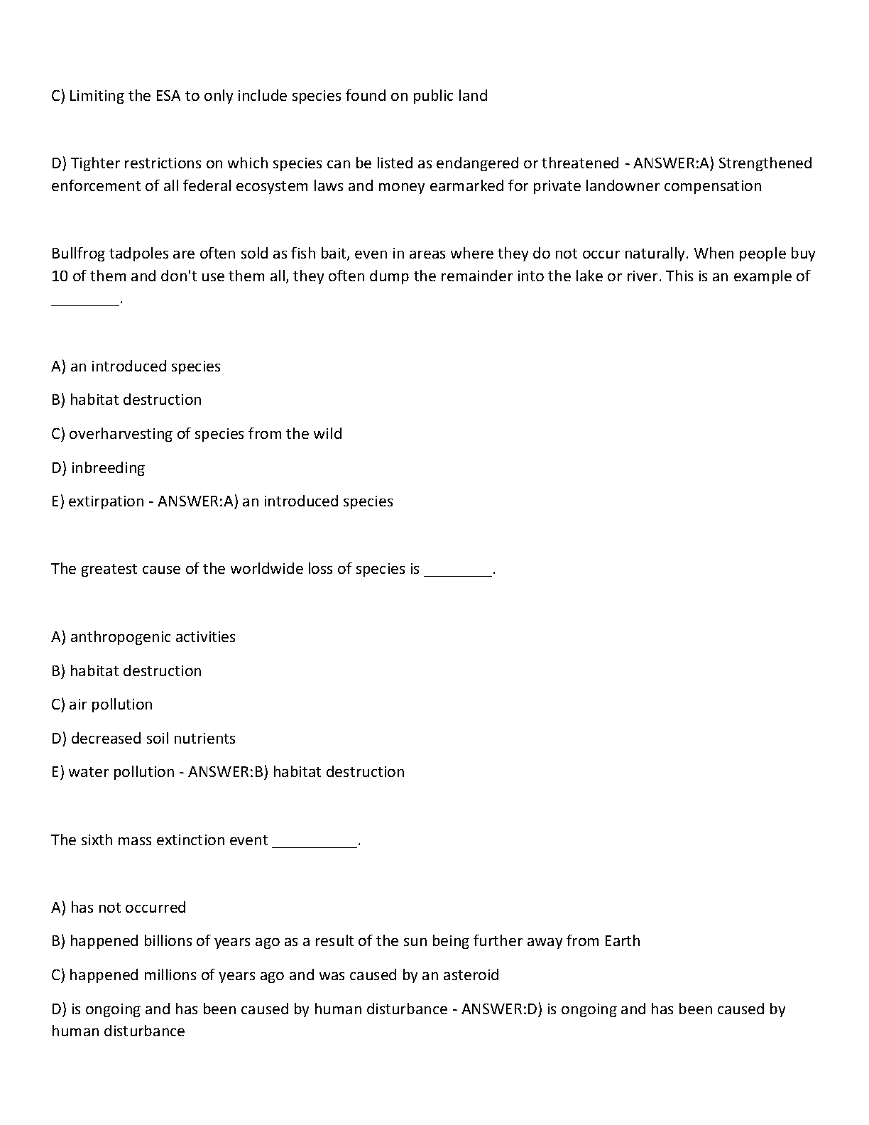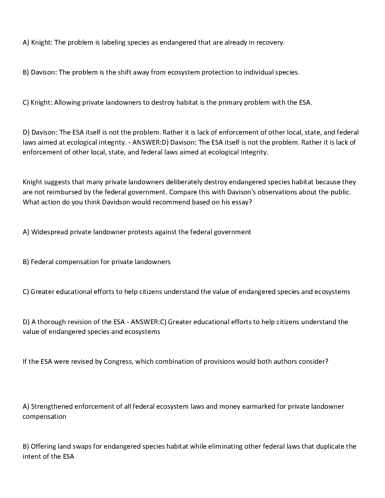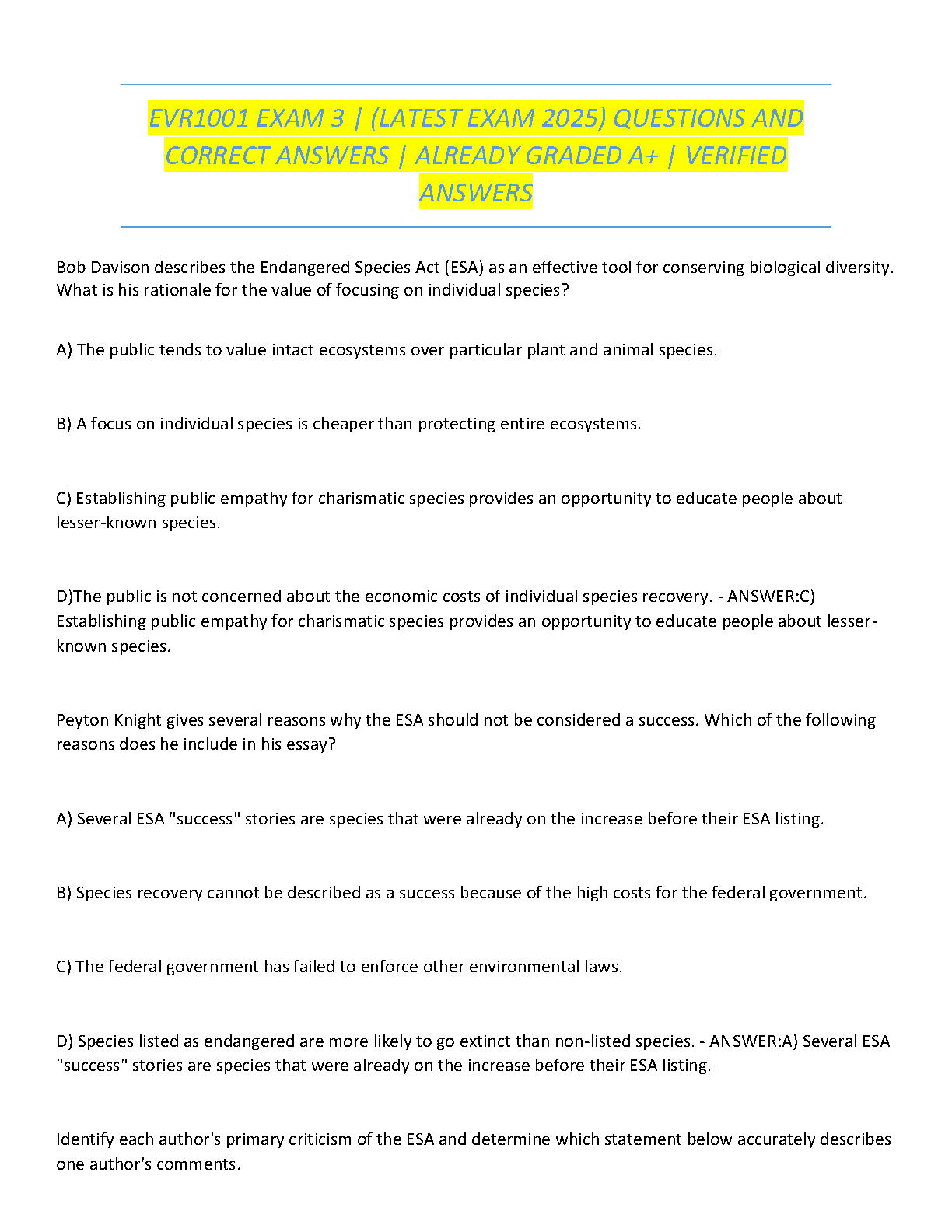 Master your Introduction to Environmental Science course with the ultimate study resource: the EVR1001 Exam 3 Test Bank for 2025. This expertly compiled guide provides a full range of exam questions paired with 100% accurate, verified answers. It's the perfect tool to deepen your understanding of key topics, including the complexities of the Endangered Species Act (ESA), and is proven to help students achieve A+ results. Prepare effectively, boost your confidence, and ace your exam with this essential preparation guide.