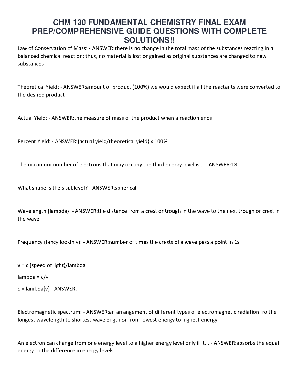 Master the essential concepts of CHM 130 Fundamental Chemistry and ace your final exam with our latest study guide for the 2025/2026 academic year. This comprehensive resource features a detailed Q&A format covering all crucial topics, including the Law of Conservation of Mass, theoretical and percent yields, electron configurations, wave properties, and the electromagnetic spectrum. Each question is paired with a clear, accurate solution, designed to help you solidify your understanding and pass your exam on the first try, eliminating the need for resits. Get the confidence you need for success!