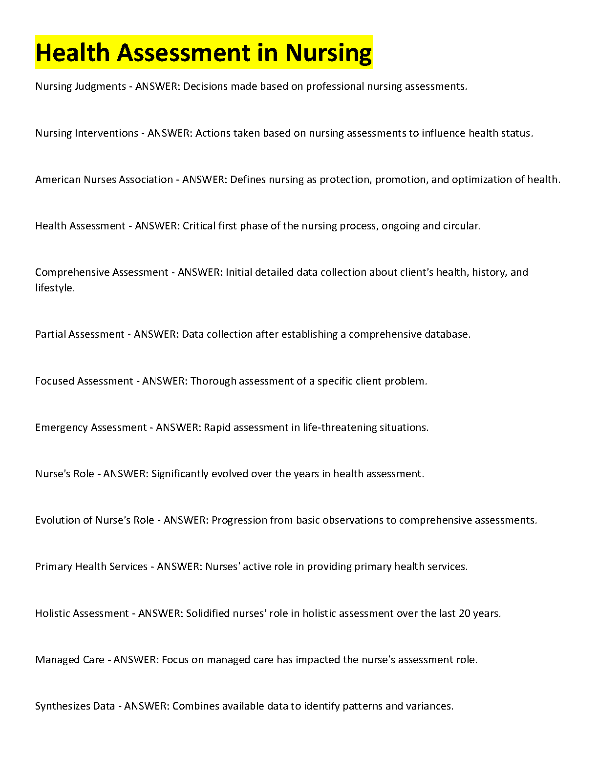Master your nursing studies with the complete Test Bank for 'Health Assessment in Nursing,' 7th Edition, authored by Janet R. Weber and Jane H. Kelley. This invaluable resource provides a comprehensive collection of questions and meticulously verified answers covering every chapter of the textbook. From foundational concepts like comprehensive and focused assessments to the intricacies of the nursing process, this test bank is designed to deepen your understanding and boost your confidence. Instantly downloadable, it's the ultimate study companion to help you ace your exams, pass on the first try, and excel in your nursing career.