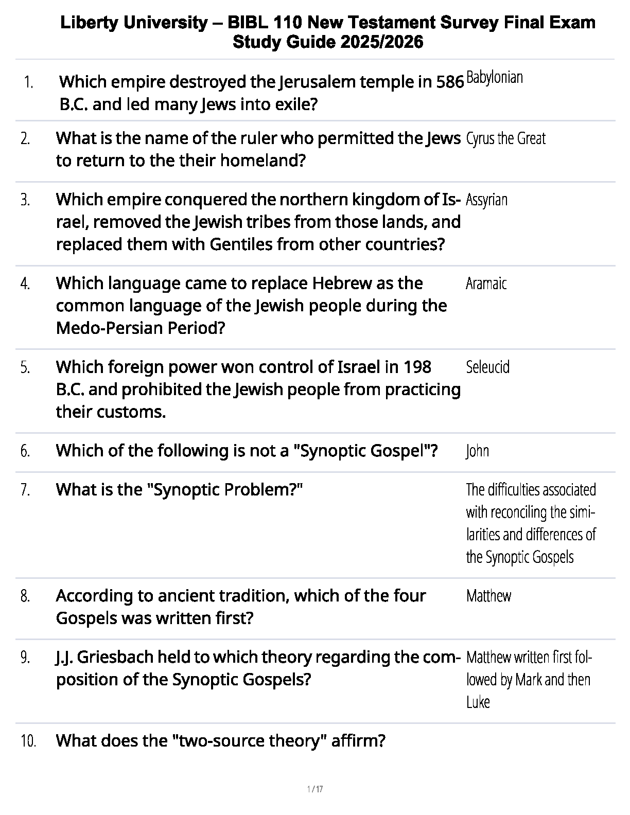 Prepare to excel in your Liberty University BIBL 110 New Testament Survey final exam with this comprehensive study guide for the 2025/2026 academic year. This guide provides a detailed set of questions and expertly verified answers, covering all critical topics from the course. From historical contexts like the Babylonian exile and the Medo-Persian period to key theological concepts such as the Synoptic Gospels and the two-source theory, this resource is your ultimate tool for effective exam preparation. Master the material, study smarter, and pass your final exam on the first attempt with confidence!