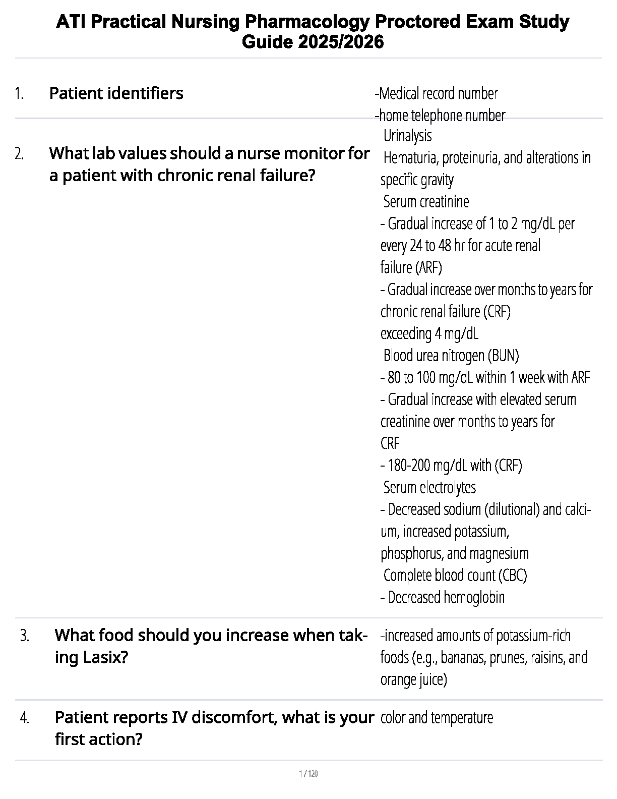 Master the ATI Practical Nursing Pharmacology Proctored Exam with our newly released study guide for the 2025/2026 academic year. This comprehensive resource is designed to help you succeed on your first try, eliminating the stress of resits. Inside, you'll find detailed questions and answers covering crucial topics such as monitoring lab values for chronic renal failure, understanding medication-related dietary adjustments (e.g., for Lasix), and prioritizing immediate nursing actions. Prepare effectively, build your confidence, and ace your pharmacology exam with this essential study companion.