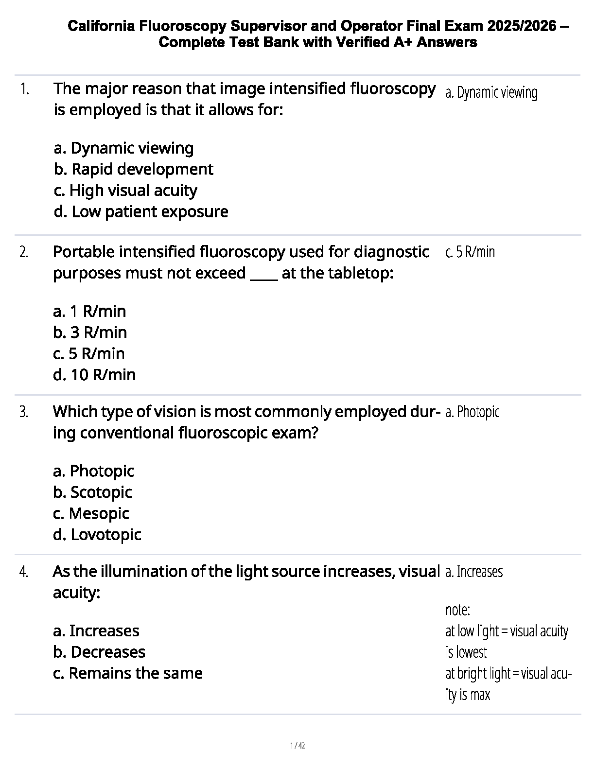 Get ready to ace your California Fluoroscopy Supervisor and Operator Final Exam with our latest 2025-2026 test bank. This complete study resource is packed with a comprehensive collection of exam questions and meticulously verified A+ answers. Designed to cover all key topics, this guide ensures you are fully prepared to pass on your first attempt. Download now to master the material, boost your confidence, and secure your certification successfully.