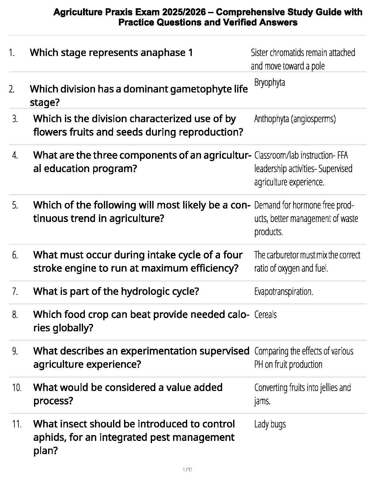 Ace your Agriculture Praxis (5701) exam on the first try with our ultimate 2025/2026 study guide! This comprehensive test bank is packed with the latest practice questions and 100% accurate, verified answers. Covering all key topics from plant and animal science, agricultural mechanics, and pest management to modern industry trends, this resource is meticulously designed to mirror the actual exam. Stop worrying about resits and start studying smarter. Get the essential tool you need for guaranteed success and to secure your teaching certification.