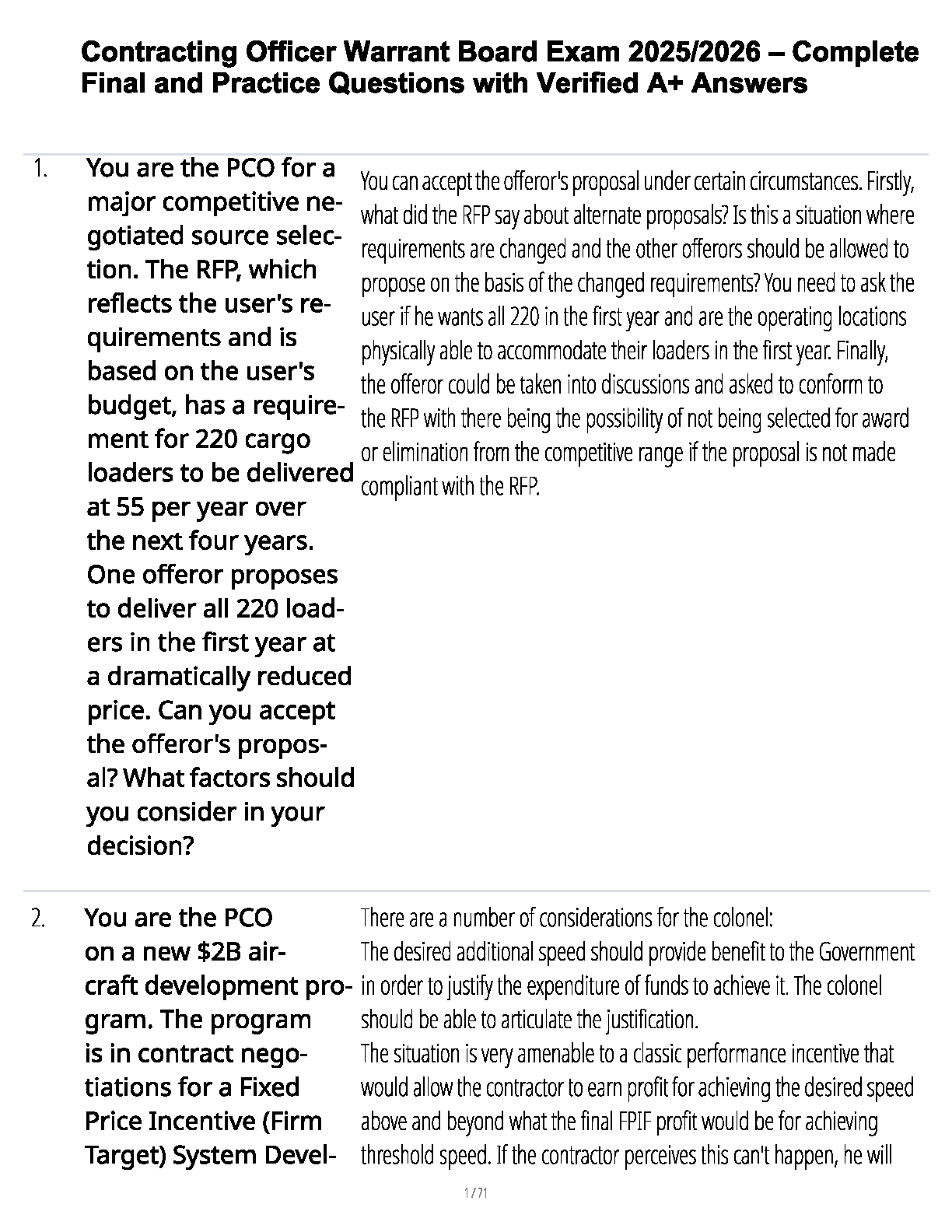 Unlock your success in the Contracting Officer Warrant Board Exam with our comprehensive 2025/2026 Test Bank. This essential study resource is packed with a full range of practice questions and meticulously verified A+ answers, mirroring the real exam format. Delve into critical scenarios covering source selection, contract negotiations, RFP analysis, and more. Each answer comes with a detailed explanation to ensure you not only memorize the correct response but also understand the underlying principles. Prepare effectively, build your confidence, and pass the Contracting Officer Warrant Board Exam on your very first attempt with this ultimate study guide.