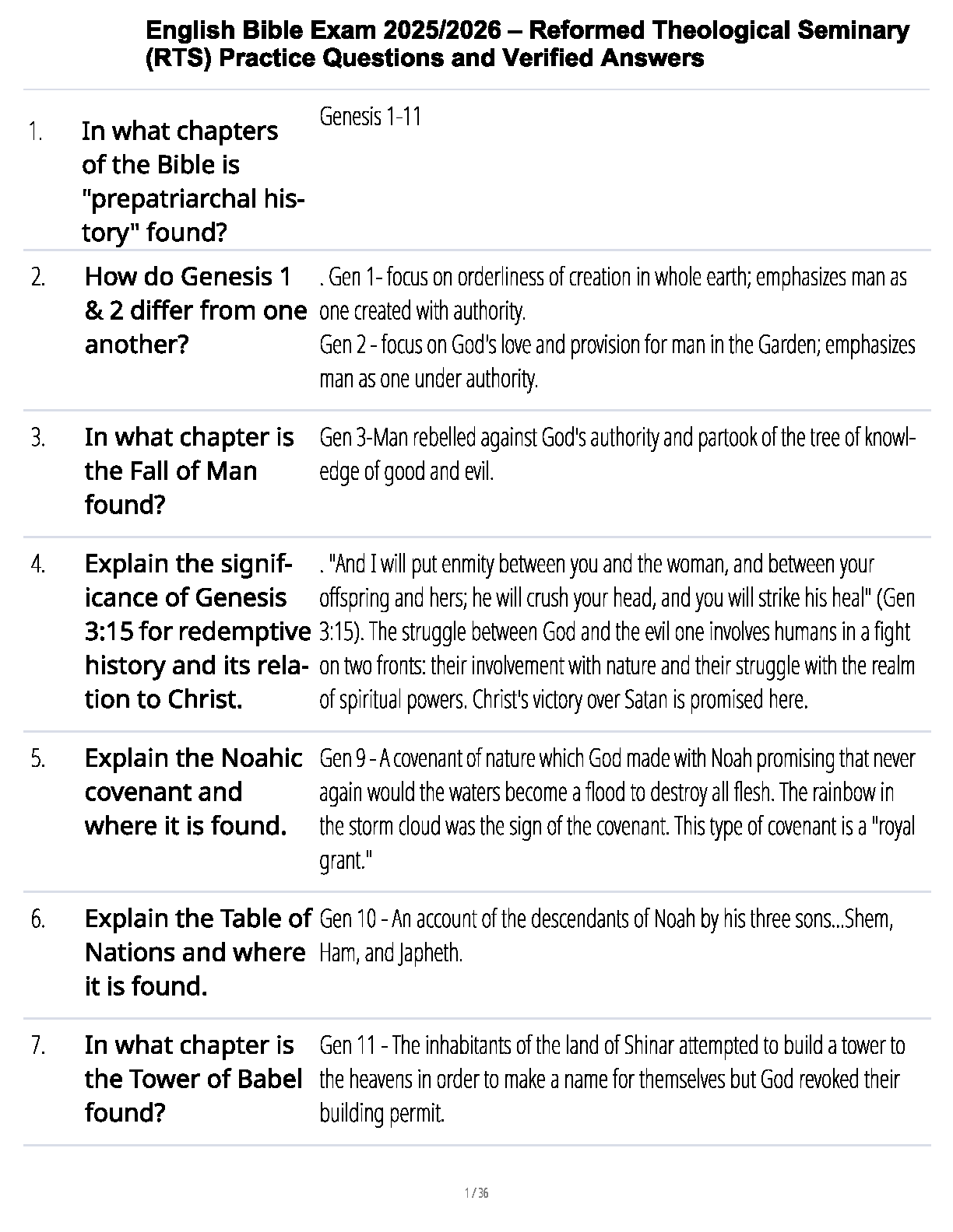 Get ready to ace your Reformed Theological Seminary (RTS) English Bible Exam with our latest 2025/2026 study guide. This comprehensive resource contains a complete collection of practice questions paired with expertly verified answers, covering all essential topics you need to know. From the prepatriarchal history in Genesis to key covenants and theological concepts, this guide is designed to streamline your study process. Master the material, walk into your exam with confidence, and secure a passing grade on your first attempt. Don't risk a resit – prepare with the best tool available for the 2025/2026 academic year.