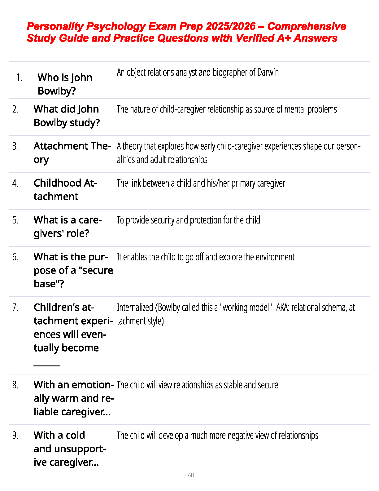 Struggling with Personality Psychology? Dominate your 2025/2026 exams with our all-in-one study guide! This comprehensive resource is packed with practice questions and expertly verified A+ answers, covering essential topics like Attachment Theory, John Bowlby, and the dynamics of personality development. Designed to simplify complex concepts, this guide is your key to mastering the material, boosting your confidence, and passing your exam on the very first attempt. Avoid resits and secure your top grade today!