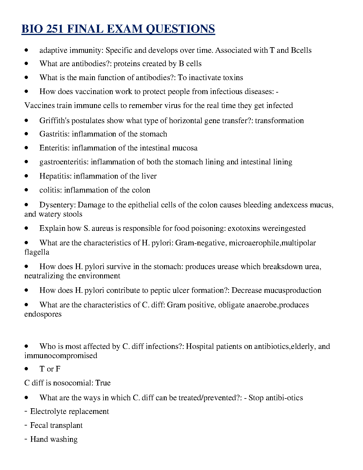 Unlock academic success with our expertly crafted BIO 251 Final Exam Elaboration for the 2025/2026 academic year. This comprehensive Q&A guide, based on the 14th Edition of 'Microbiology: An Introduction' by Gerard J. Tortora, Berdell R. Funke, and Christine L. Case, is your ultimate tool to pass on the first attempt. It provides clear, concise answers to key exam questions covering crucial topics such as adaptive immunity, antibody functions, bacterial pathogenesis (H. pylori, C. diff), and inflammation. Avoid resits by mastering the core concepts with this essential study resource.