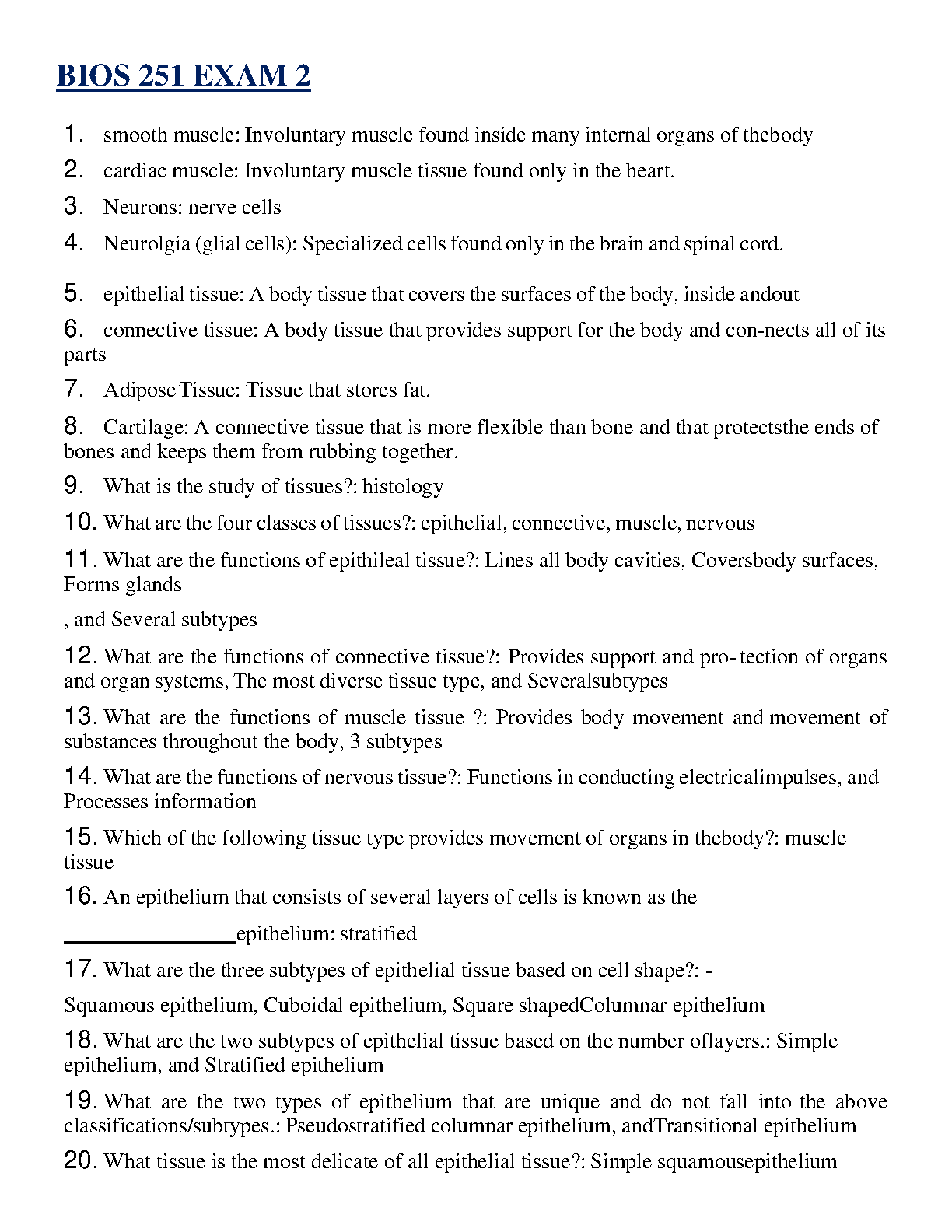 Excel in your Anatomy and Physiology course with this comprehensive study guide for BIOS 251 Exam 2, updated for the 2025/2026 academic year. This resource provides detailed elaborations on all key topics for your second exam, focusing on tissues and histology. It covers everything from the four primary tissue types—epithelial, connective, muscle, and nervous—to their specific functions, subtypes, and locations in the body. The clear question-and-answer format makes it easy to review and master essential concepts like smooth vs. cardiac muscle, neurons, glial cells, and various epithelial classifications. This is the ultimate tool to solidify your understanding and ensure you pass your exam with confidence, avoiding any need for resits.