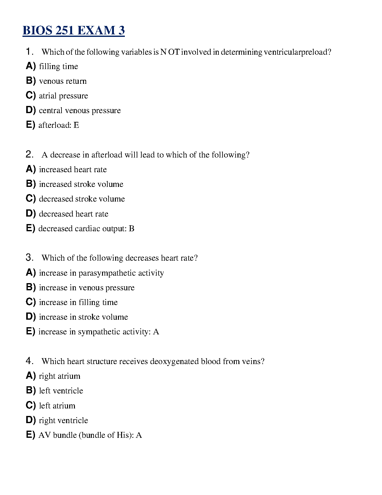 Ace your BIOS 251 Anatomy and Physiology Exam 3 with this detailed test bank! This resource provides a complete set of multiple-choice questions with verified answers, focusing specifically on the cardiovascular system. Master complex topics such as ventricular preload, afterload, stroke volume, heart rate regulation, and the anatomy of blood flow. This study guide is designed to mirror the format of your actual exam, making it the perfect tool to test your knowledge, identify weak spots, and ensure you're fully prepared to succeed. Download now for instant access to the questions and answers you need to pass your cardiovascular module with confidence.