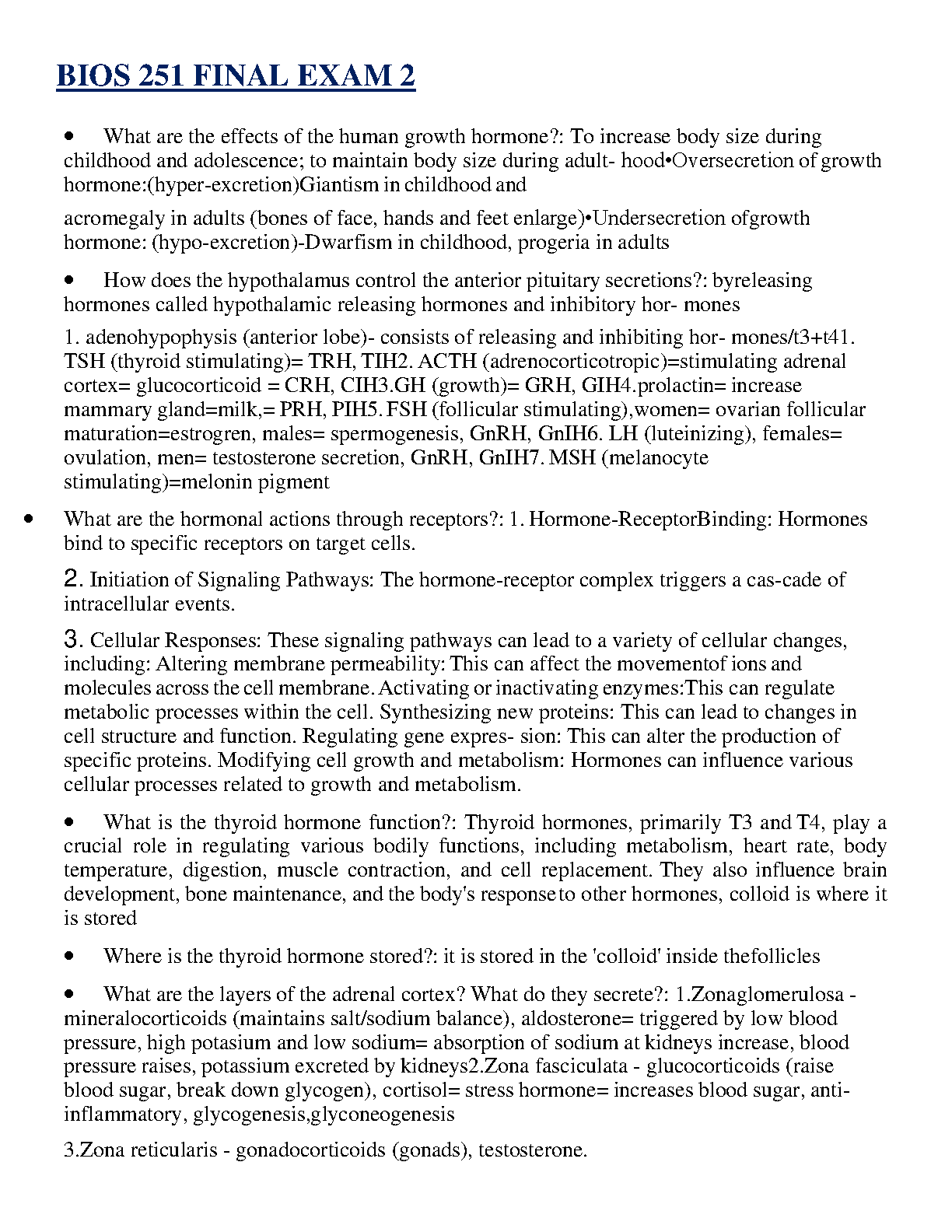 Ace your BIOS 251 Final Exam 2 with this ultimate Q&A study guide, fully updated for the 2025/2026 academic year. This resource provides detailed, easy-to-understand answers to crucial questions on the endocrine system, covering topics like human growth hormone, hypothalamus control, pituitary secretions, thyroid function, and the adrenal cortex. Designed to help you master complex concepts and pass your exam on the first attempt, this guide is your key to avoiding resits and achieving academic success in your anatomy and physiology course.