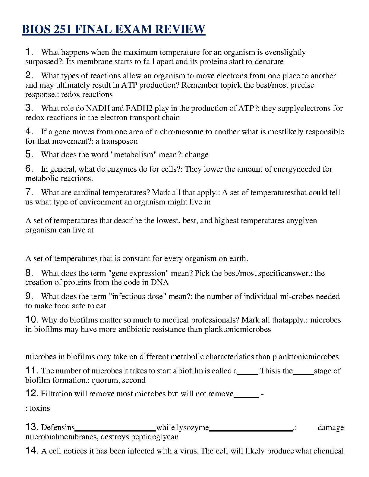 Unlock your full potential with our latest 2025/2026 Final Exam Review for BIOS 251! This meticulously crafted study guide provides in-depth questions and answers on all crucial topics, including cellular metabolism, redox reactions, gene expression, microbial control, and biofilm formation. Designed to align with key concepts from the leading textbook 'Microbiology: An Introduction, 13th Edition' by Tortora, Funke, and Case, this resource is your ultimate tool for success. Stop stressing about resits and confidently prepare to ace your final exam on the very first try. Download now and secure your A!