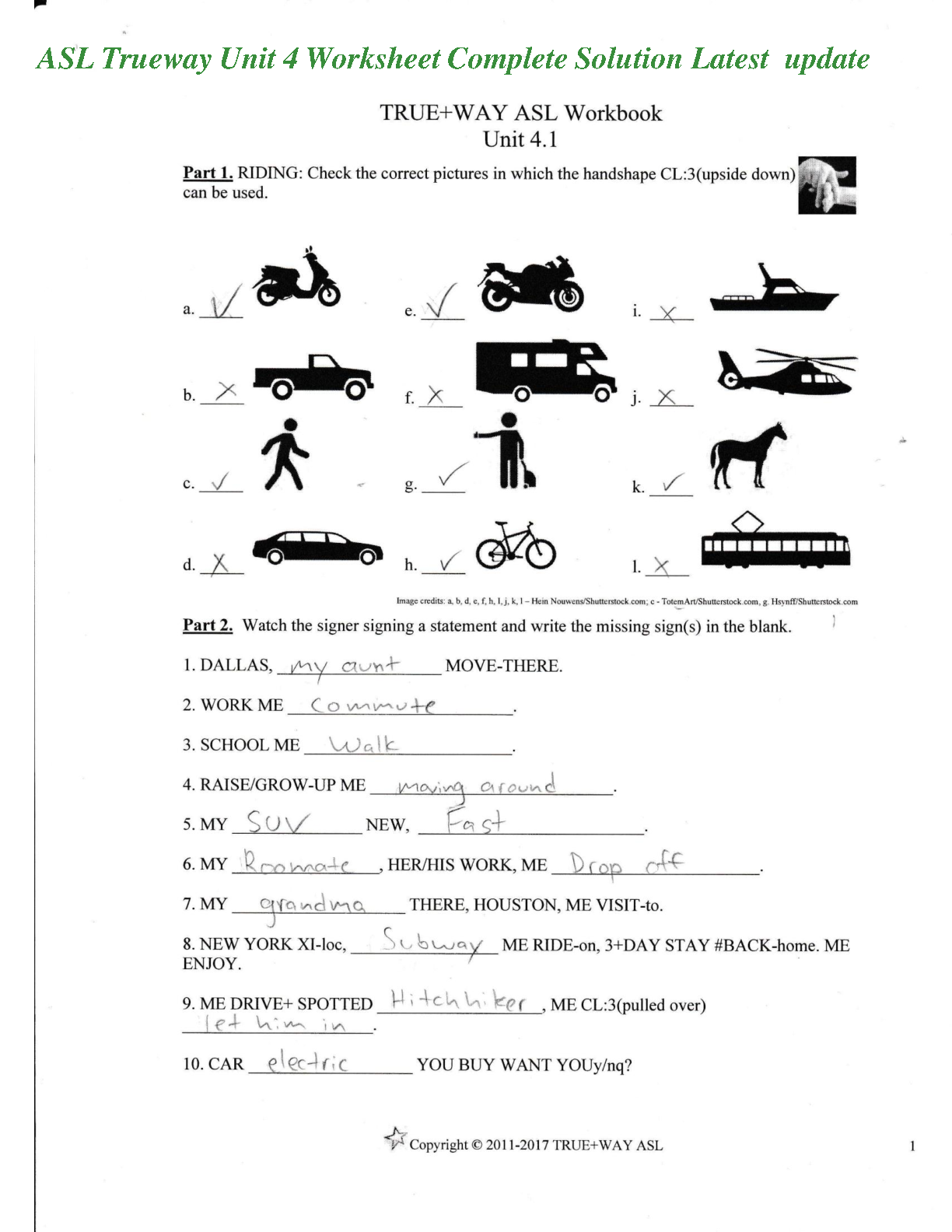 Unlock the complete, verified solutions for the TRUE+WAY ASL Unit 4 Workbook with this comprehensive answer key. Developed by ASL experts like Darlene D. Hamilton, Oya Ataman, and Miako Villanueva, this resource provides step-by-step answers for every exercise in Unit 4.1, focusing on transportation vocabulary and the use of classifiers. Instantly verify your homework, deepen your understanding of ASL grammar, and prepare effectively for your exams. This digital solution manual is your essential tool for mastering the material and achieving top grades in your American Sign Language course.