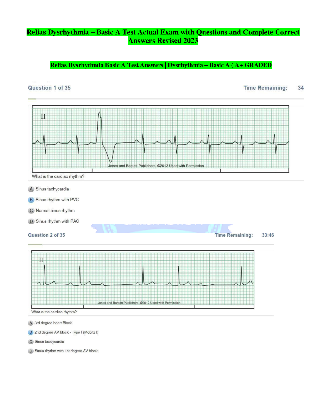 Prepare to excel in your certification with the complete Relias Dysrhythmia Basic A Test Bank for 2023. This A+ graded study guide features an extensive collection of actual exam questions paired with 100% correct, verified answers. Master the art of EKG interpretation and confidently identify various cardiac rhythms. This resource is expertly designed to help nursing students and healthcare professionals pass their Relias Dysrhythmia exam with top scores on the first attempt.