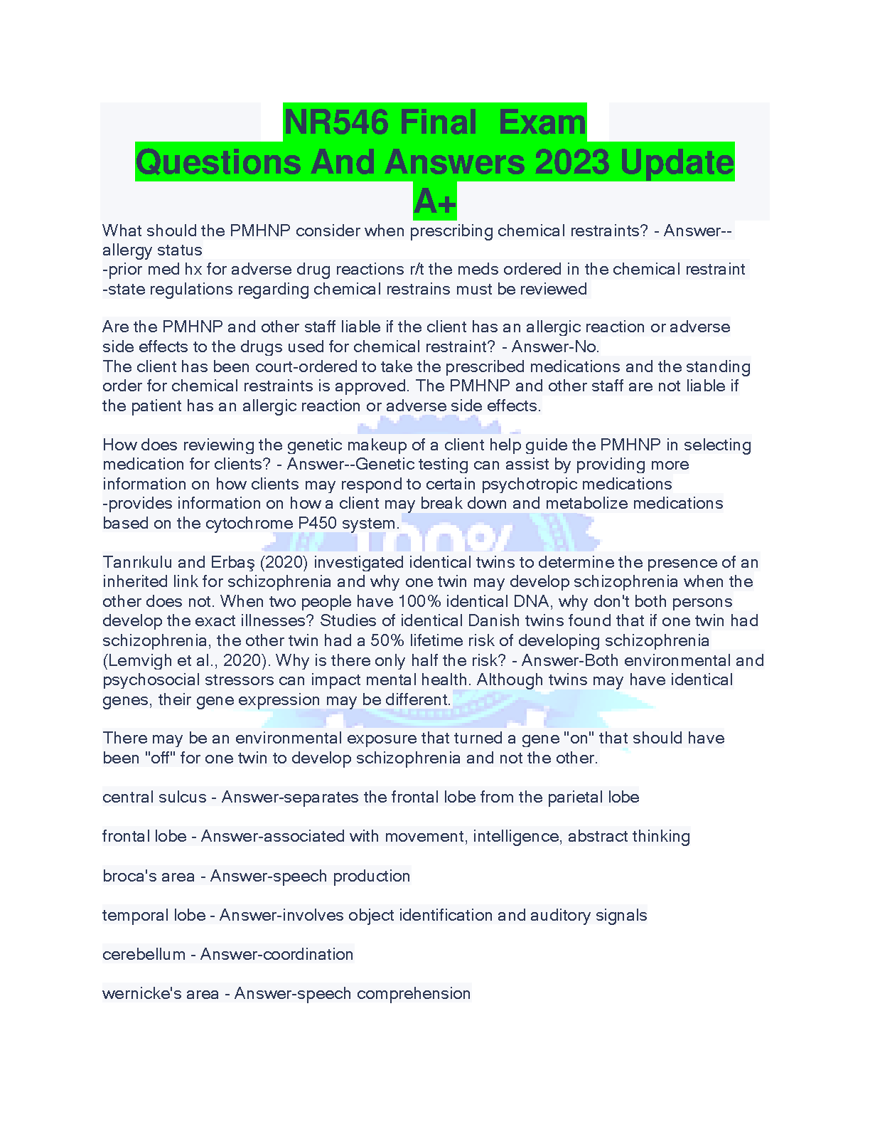 Achieve a top grade on your NR546 Final Exam with our newly updated 2025/2026 study guide. This comprehensive resource is packed with verified questions and detailed answers designed to help you master the core concepts of Advanced Pharmacotherapeutics. Dive deep into crucial topics such as the PMHNP's role in prescribing chemical restraints, genetic testing for medication selection, the neurobiology of schizophrenia, and the functions of key brain areas. This guide is your ultimate tool to study effectively, avoid resits, and pass your NR546 final exam on the very first try. Get the A+ you deserve!