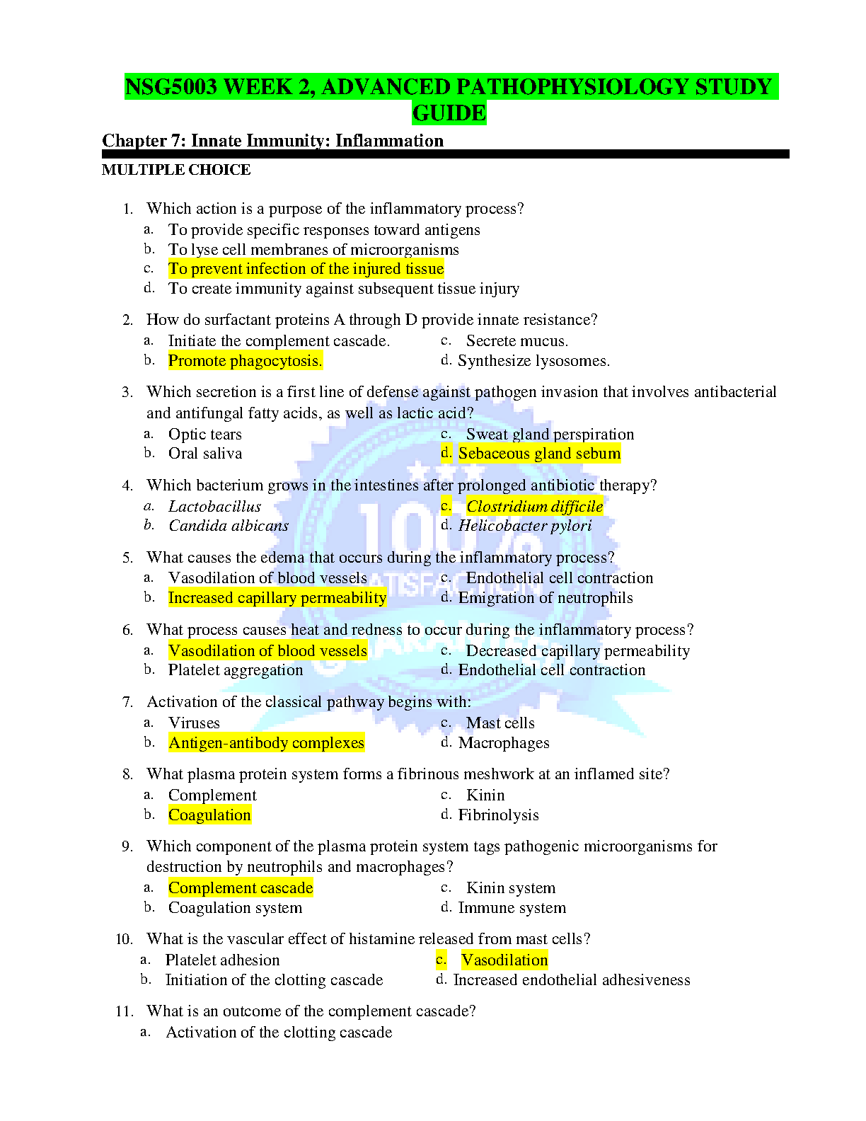Unlock your full potential in NSG5003 Advanced Pathophysiology with this comprehensive test bank for Week 2, based on Chapter 7 of 'Pathophysiology: The Biologic Basis for Disease in Adults and Children,' 9th Edition by Kathryn L. McCance and Sue E. Huether. This essential study tool covers the critical topic of Innate Immunity and Inflammation. Featuring a complete set of multiple-choice questions with verified, highlighted answers, this resource is meticulously designed to help you grasp complex concepts, ace your exams, and build a strong foundation in pathophysiology. Download now to streamline your studies and achieve academic success.