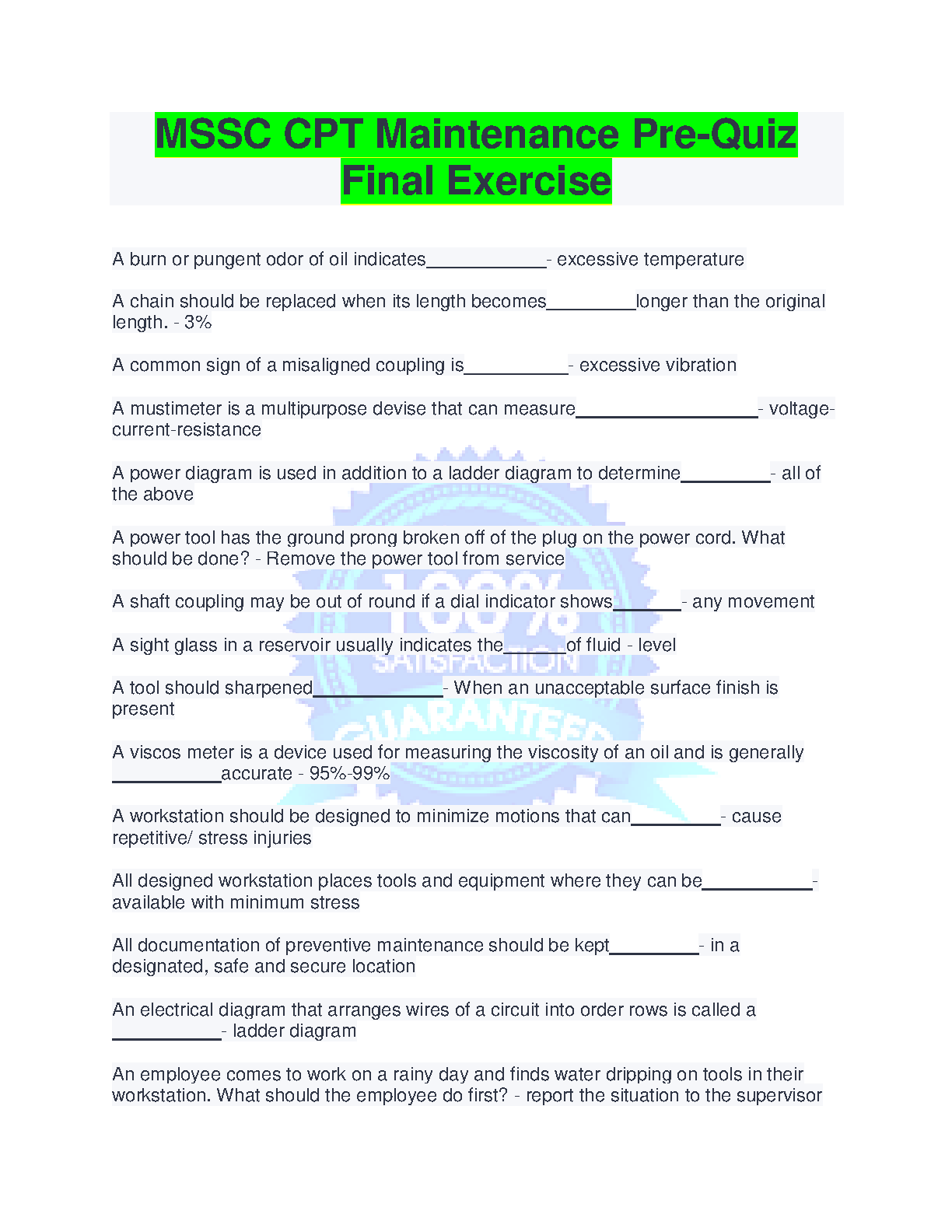Ace your Manufacturing Skill Standards Council (MSSC) Certified Production Technician (CPT) exam with our premier test bank for the Maintenance Awareness module. This comprehensive 2025/2026 study guide is expertly crafted to ensure you pass on your very first try. Inside, you'll find an extensive collection of real exam-style questions and detailed, verified answers covering all critical maintenance topics, including equipment safety, preventive maintenance, tool usage, and troubleshooting. Stop worrying about resits and start your journey to certification success. Download now and master the essential knowledge needed to become a certified production technician.