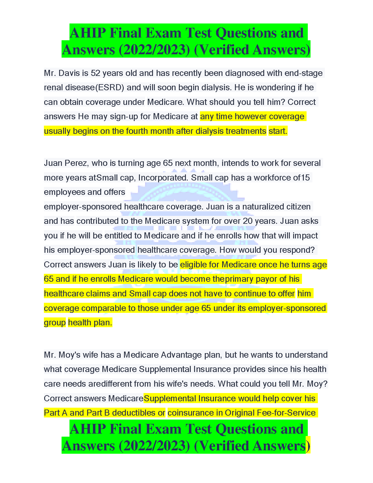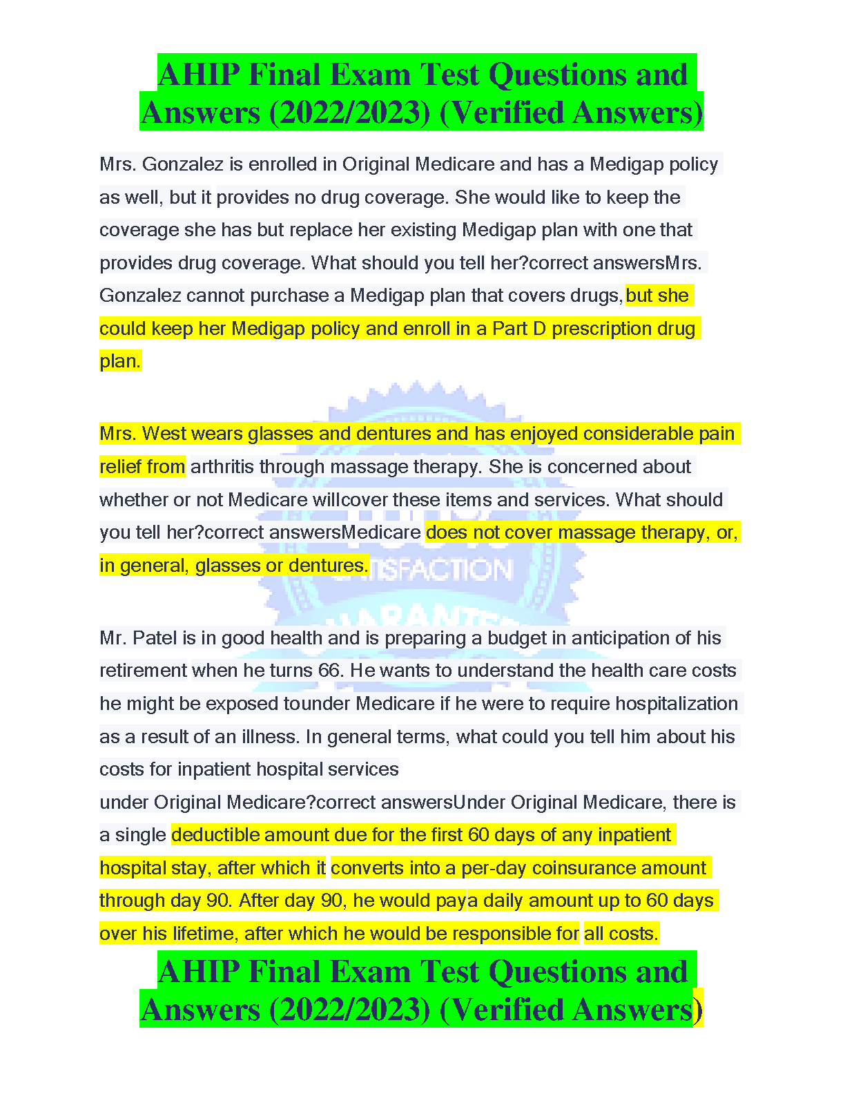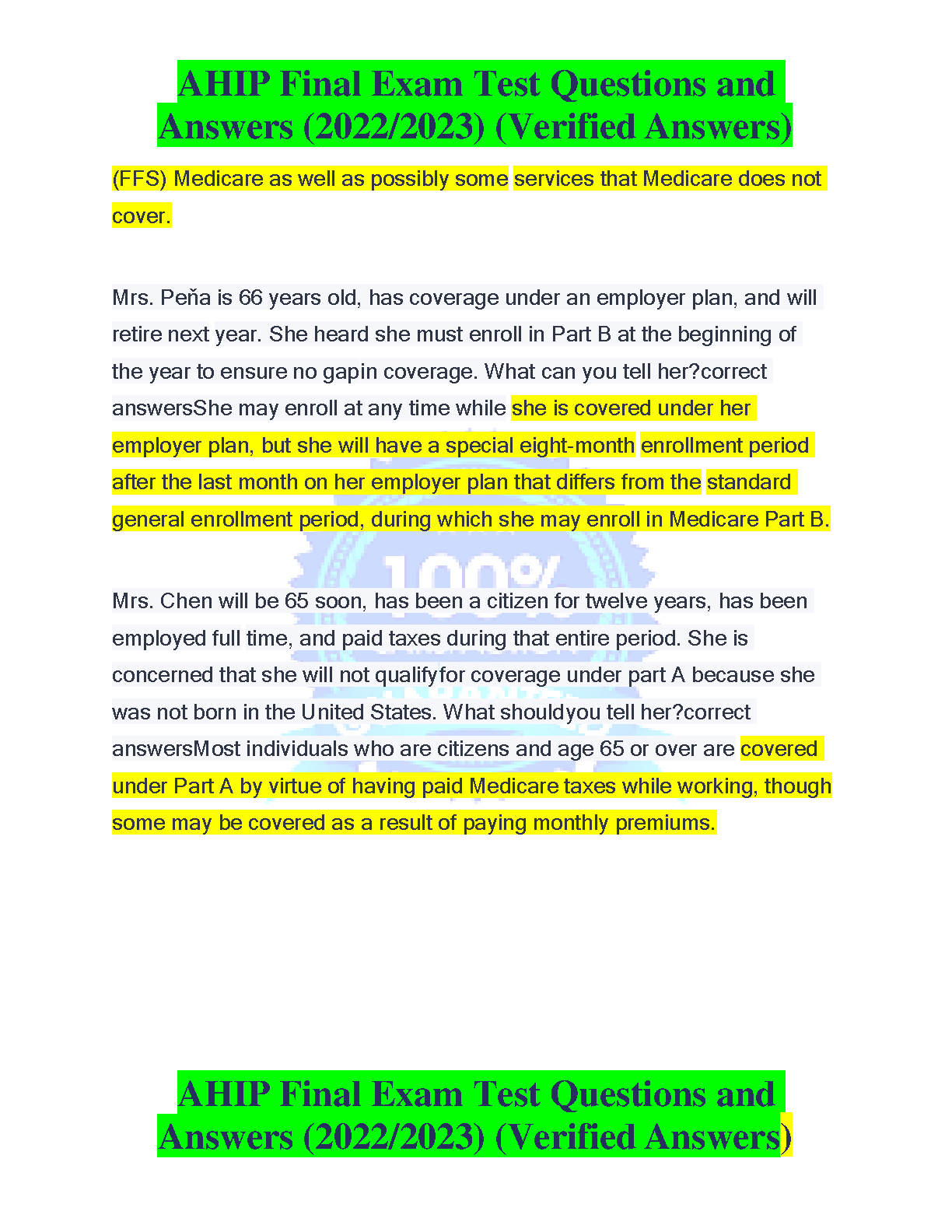 Ace your AHIP certification with our latest 2025/2026 Final Exam Test Bank! This comprehensive guide features a complete collection of verified test questions and detailed answers, covering all critical topics you'll face on the real exam. Designed to help you master complex scenarios involving Medicare eligibility, coverage rules, and supplemental plans, our expertly verified solutions ensure you understand the material thoroughly. Build the confidence you need to pass on your very first attempt, avoid costly resits, and secure your certification with this essential study tool.