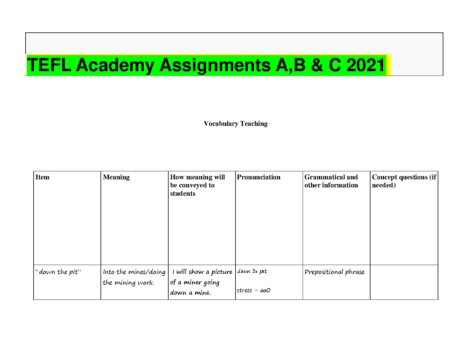 Excel in your TEFL certification with our comprehensive guide to The TEFL Academy Assignments A, B & C, fully updated for the 2025/2026 academic year. This resource provides a detailed, high-quality example of the Vocabulary Teaching section, demonstrating how to effectively define items, explain meaning, pronunciation, and grammatical information. Avoid the stress of resits and secure a passing grade on your first attempt with this essential study aid. Perfect for aspiring English teachers looking for a clear path to success.