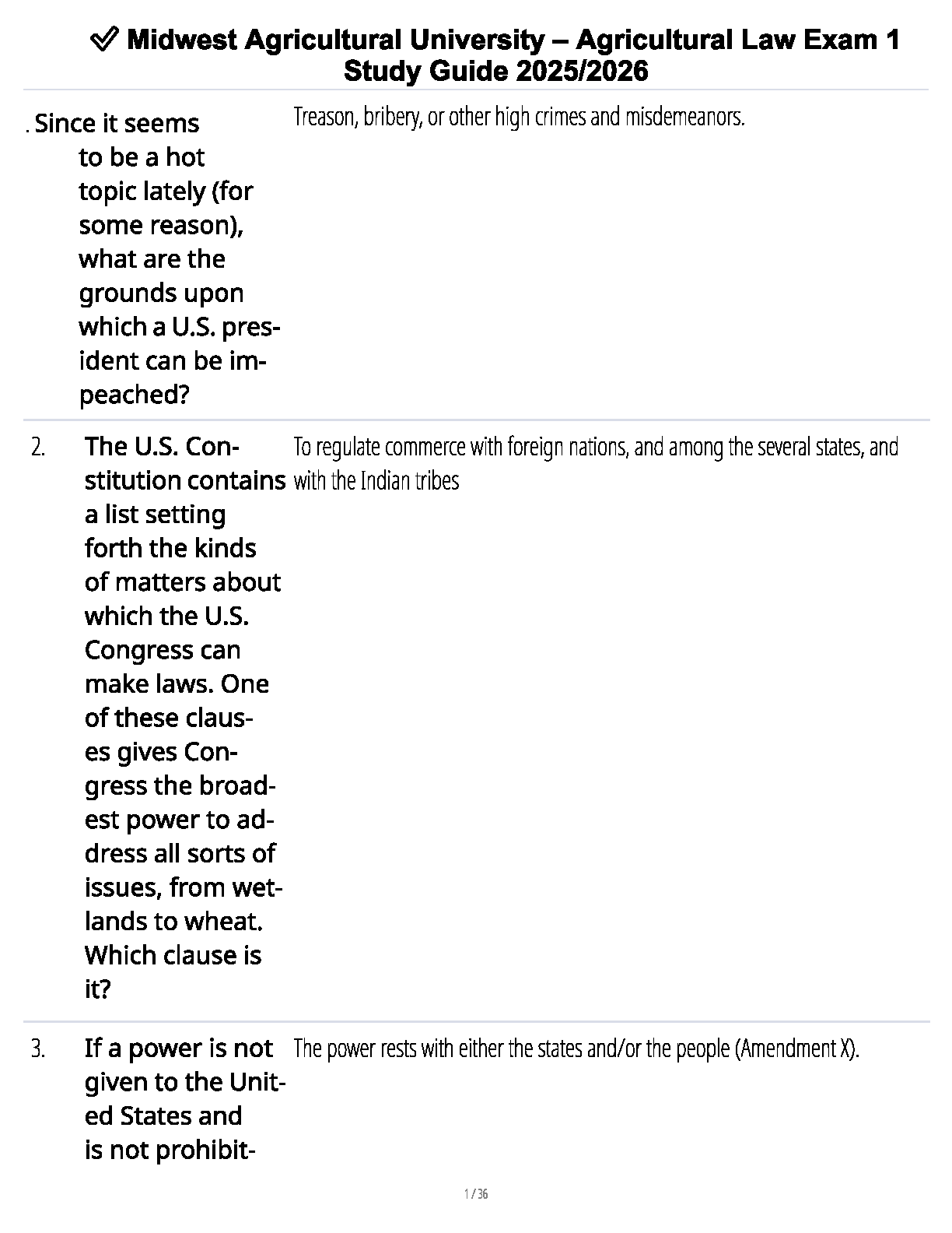 Unlock success in your Agricultural Law course with this essential Exam 1 Study Guide, fully updated for the 2025/2026 academic year. This resource, tailored for students at Midwest Agricultural University, provides a comprehensive question-and-answer format covering crucial legal concepts. Delve into key topics like the U.S. Constitution, the Commerce Clause, and states' rights to ensure you're thoroughly prepared. This guide is your ultimate tool to master the material, pass your exam on the first attempt, and avoid the need for costly resits.