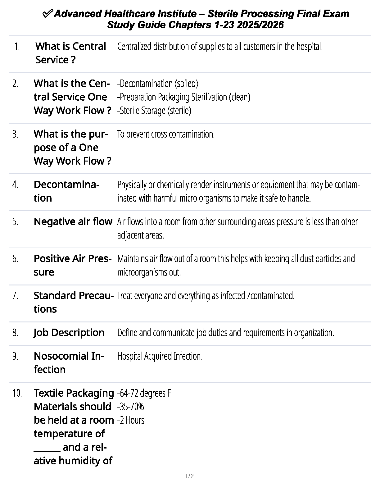 Unlock success in your Sterile Processing Final Exam with this comprehensive study guide from the Advanced Healthcare Institute, fully updated for the 2025/2026 academic year. This resource provides detailed questions and answers covering all 23 chapters, ensuring a thorough understanding of critical topics such as central service workflow, decontamination, infection control, and sterile storage. Designed to help you master the material efficiently, this guide is your key to passing the exam on the first attempt and advancing your healthcare career.