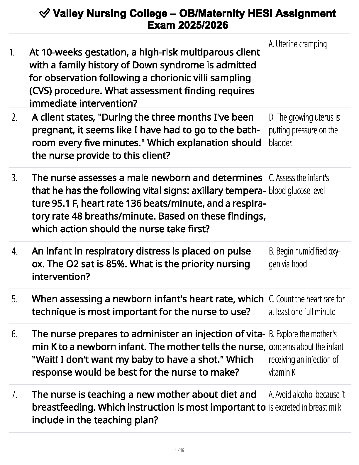 Ace your OB/Maternity nursing course with our latest 2025/2026 HESI Exam Test Bank. This comprehensive study guide provides a complete set of exam-style questions and verified answers, covering all critical topics from prenatal care and high-risk pregnancies to newborn assessment and postpartum support. Designed to mirror the actual HESI exam format, this resource is your key to mastering complex concepts, building confidence, and passing with flying colors on your very first attempt. Stop stressing and start studying smart with this essential tool for nursing success.