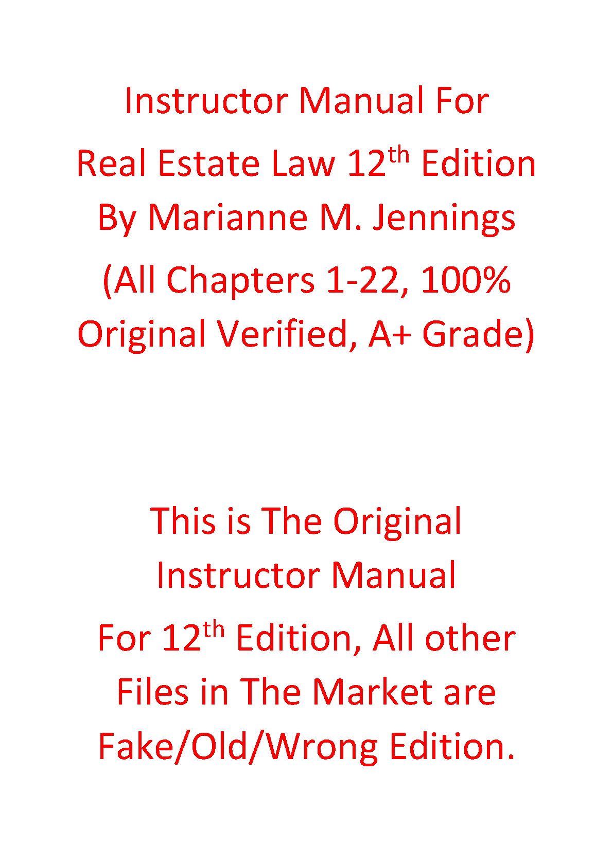 Unlock your potential with the official and verified Instructor Manual for 'Real Estate Law, 12th Edition' by Marianne M. Jennings. This comprehensive resource covers all 22 chapters, providing A+ grade material to ensure you master every concept. This is the authentic, original manual, perfect for instructors preparing lessons and students aiming for top exam scores. Avoid incomplete or outdated versions and get the definitive guide to succeed in your real estate law course.