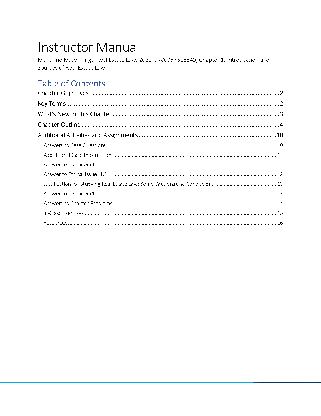 Instructor Manual for Real Estate Law, 12th Edition by Marianne M. Jennings (Complete, Chapters 1-22)