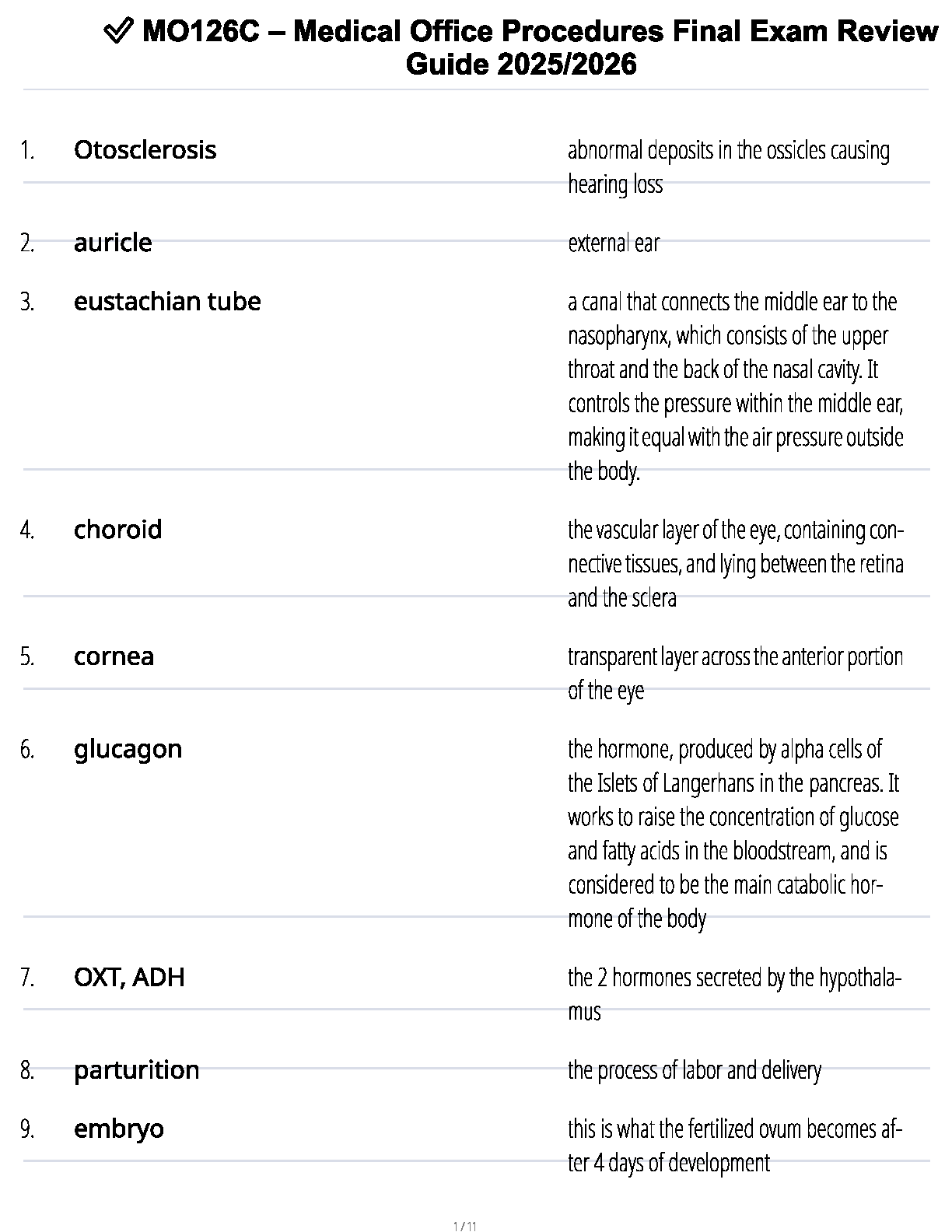 Ace your MO126C Medical Office Procedures final exam with this comprehensive and up-to-date review guide for the 2025/2026 academic year. This detailed study resource provides clear and concise definitions for all crucial terminology, covering essential topics in anatomy and physiology relevant to medical office procedures. Stop worrying about resits—this guide is expertly designed to give you the knowledge and confidence to pass your final exam on your very first attempt.