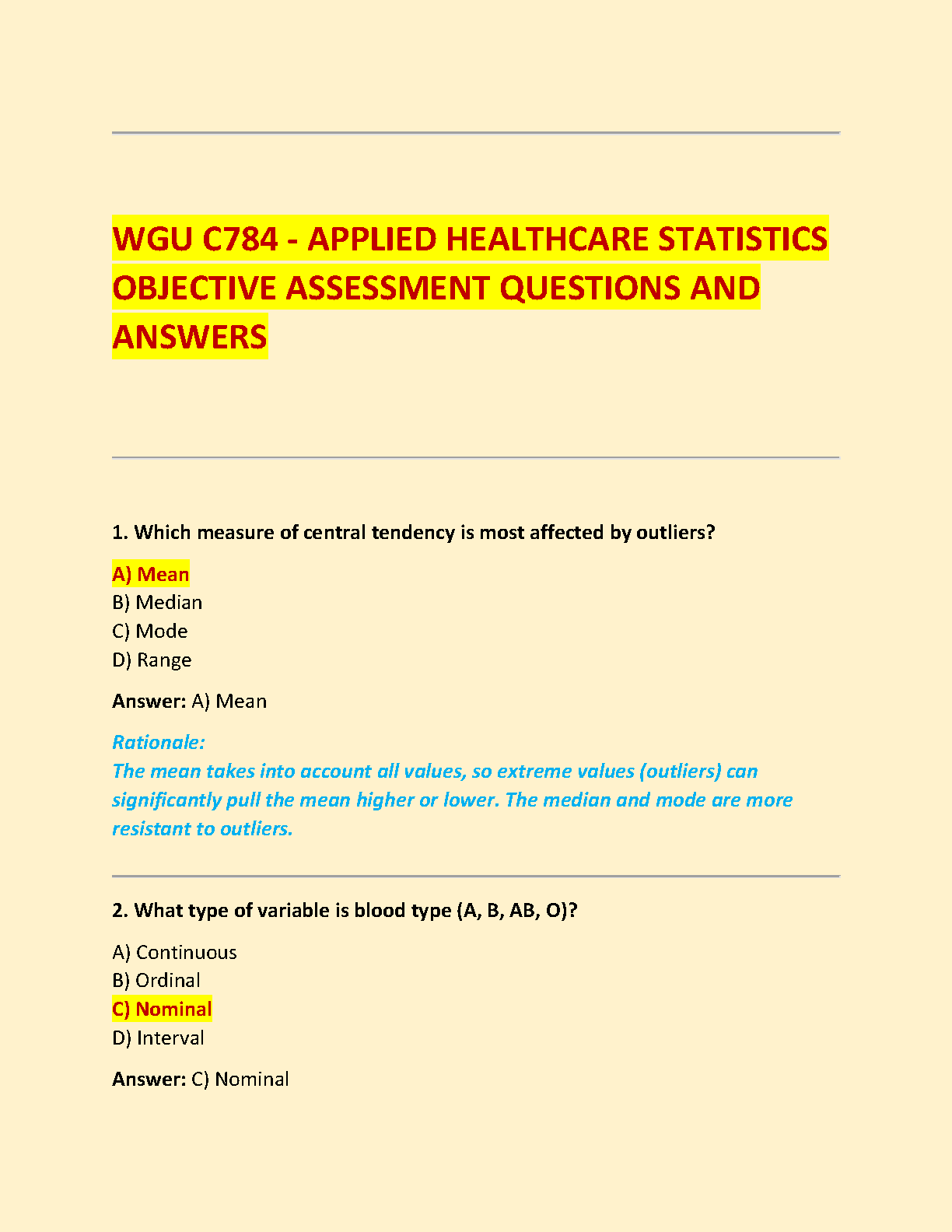 Ace your WGU C784 Applied Healthcare Statistics exam with our latest 2025/2026 study guide. This comprehensive resource is packed with objective assessment questions, complete with verified answers and detailed rationales to clarify complex concepts. Designed to mirror the actual exam, this test bank will help you master topics like central tendency, variable types, and more. Prepare effectively, build your confidence, and pass the C784 assessment on your very first attempt!